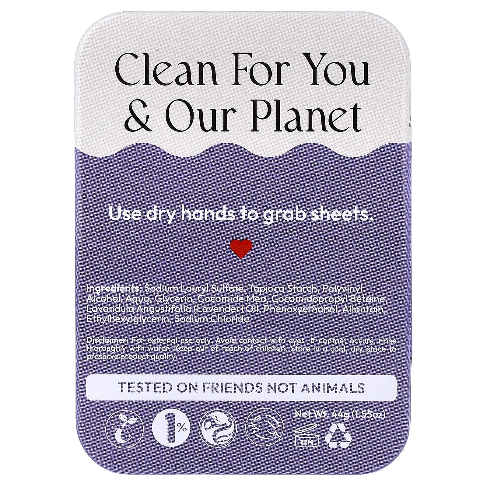 Лаурилсульфата натрия, крахмал тапиоки, поливиниловый спирт, вода (Aqua), глицерин, кокамид МЭА, кокамидопропилбетаин, лавандовое масло (Lavandula angustifolia), феноксиэтанол, Аллантоин, этилгексилглицерин, хлорид натрия.