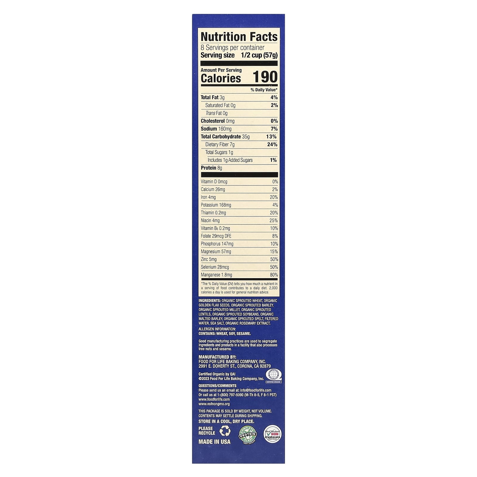 Органическая пророщенная пшеница, органические семена золотистого льна, органический ячмень, органическое просо, органическая чечевица, органические ростки сои, органический солодовый ячмень, органические пророщенные полбы, очищенная вода, морская соль, экстракт органического розмарина