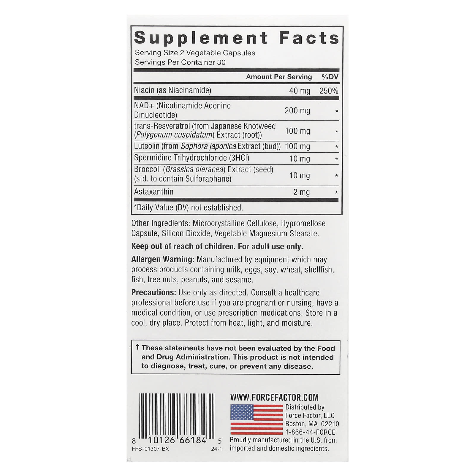 Комплекс питательных веществ Force Factor® NAD + Longevity - это эффективная формула, поддерживающая здоровое старение. Каждая доза содержит эффективную смесь витамина B3, антиоксидантов и растительных экстрактов, подтвержденную последними исследованиями для поддержки общего здоровья и долголетия организма - от восстановления и омоложения клеток до здоровья глаз, когнитивной и сердечно-сосудистой функций. Добавьте его в свой распорядок дня и будьте уверены, зная, что вы хорошо позаботитесь о своем будущем.
