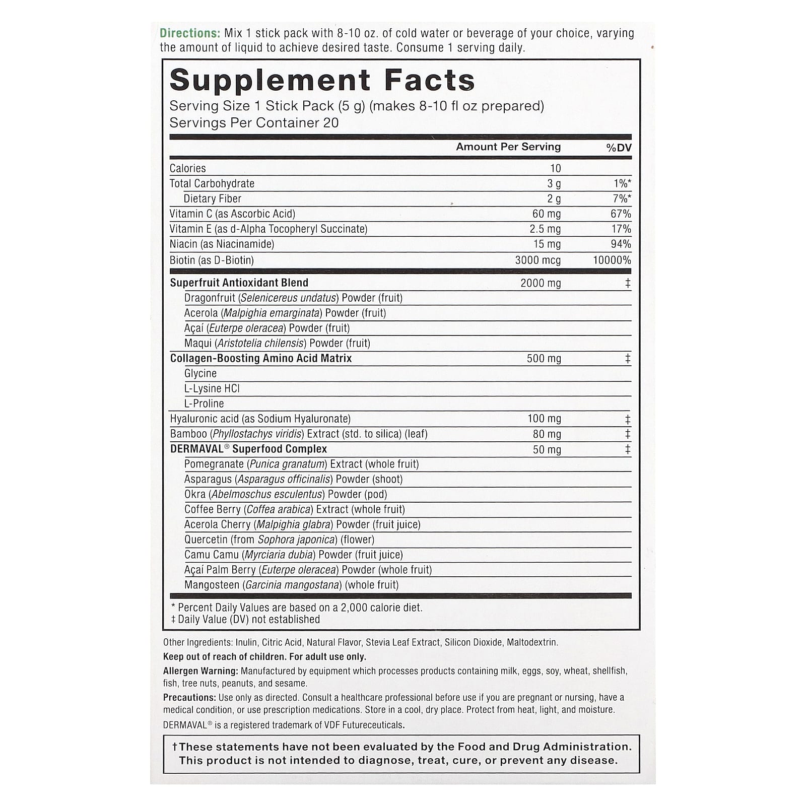 Суперпродукты для повышения уровня коллагена - это эффективный способ повысить и защитить естественную выработку коллагена в организме. Благодаря смеси клинически изученных питательных веществ, включая комплекс суперфудов DERMAVAL®, бамбук, биотин, гиалуроновую кислоту и витамины C и E, каждый освежающий глоток восстанавливает естественную эластичность вашей кожи, обеспечивая целостную поддержку здоровья волос, кожи и ногтей.