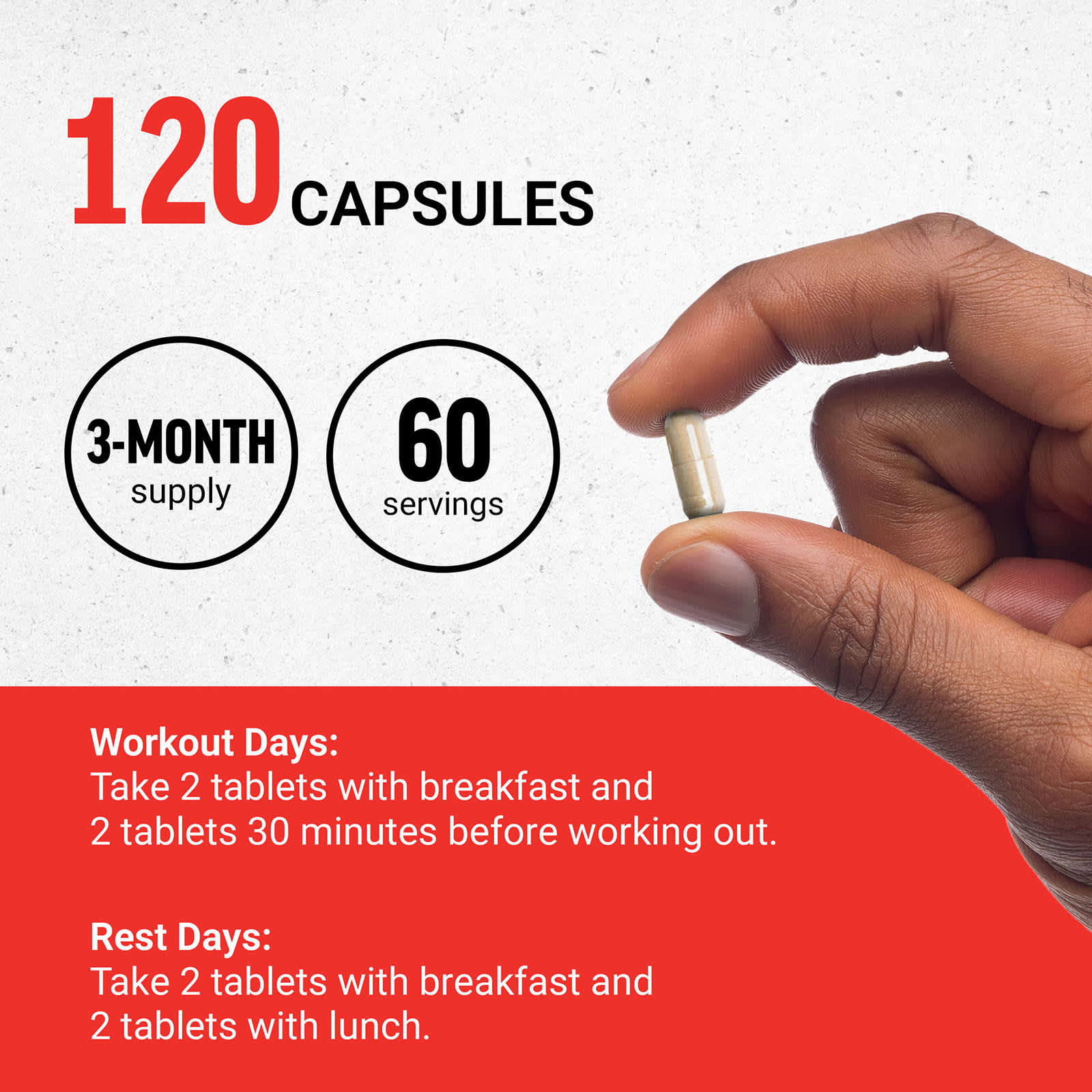 Дни тренировок: Примите 2 таблетки во время завтрака и 2 таблетки за 30 минут до тренировки.