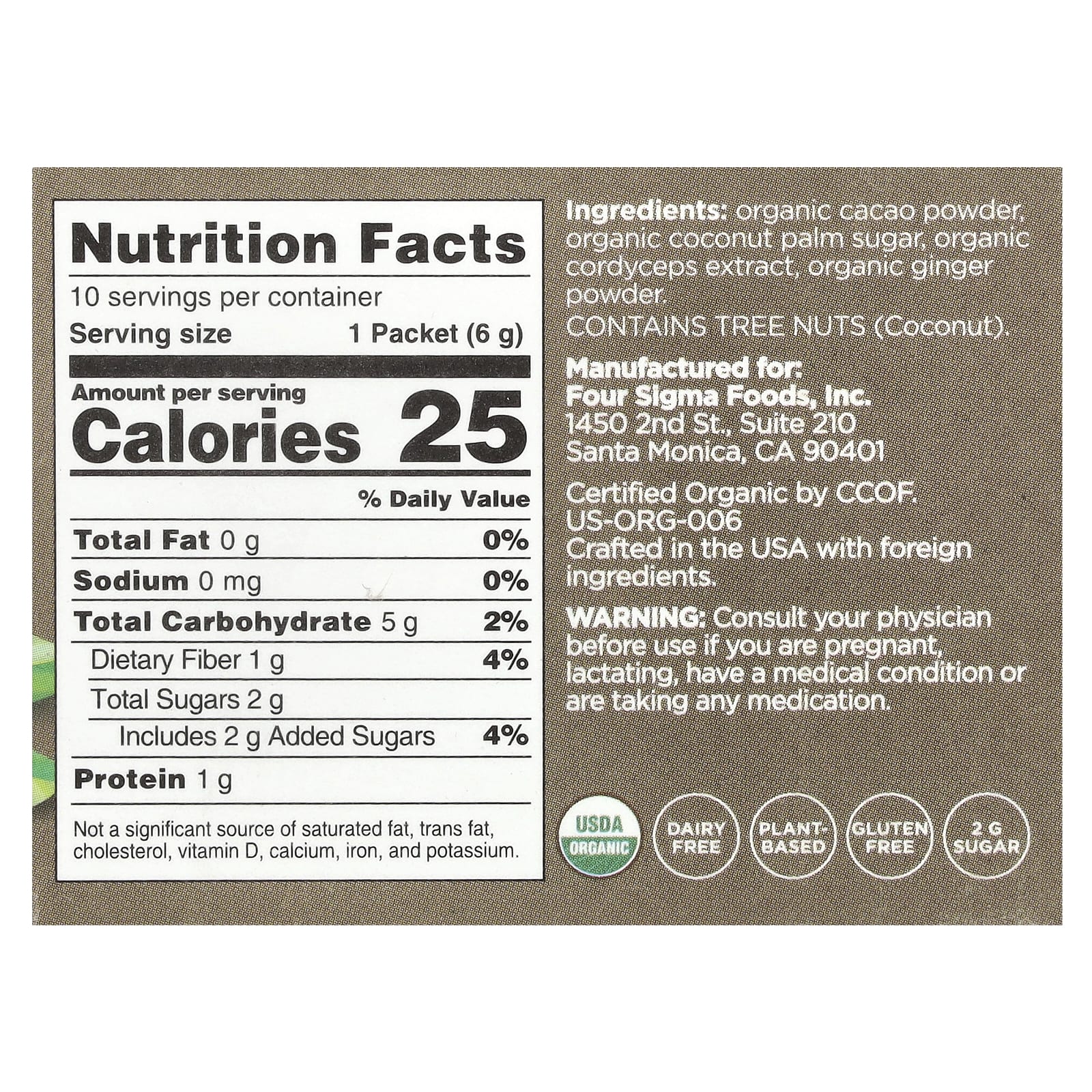 Органический какао-порошок, органический сахар из кокосовой пальмы, органический экстракт кордицепса, порошок из органического имбиря.