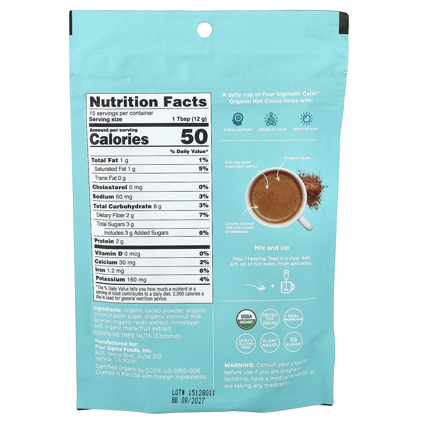 Органический какао-порошок, органический кокосовый сахар, порошок из органического кокосового молока, органический экстракт рейши, Гималайская соль, органический экстракт архата.
