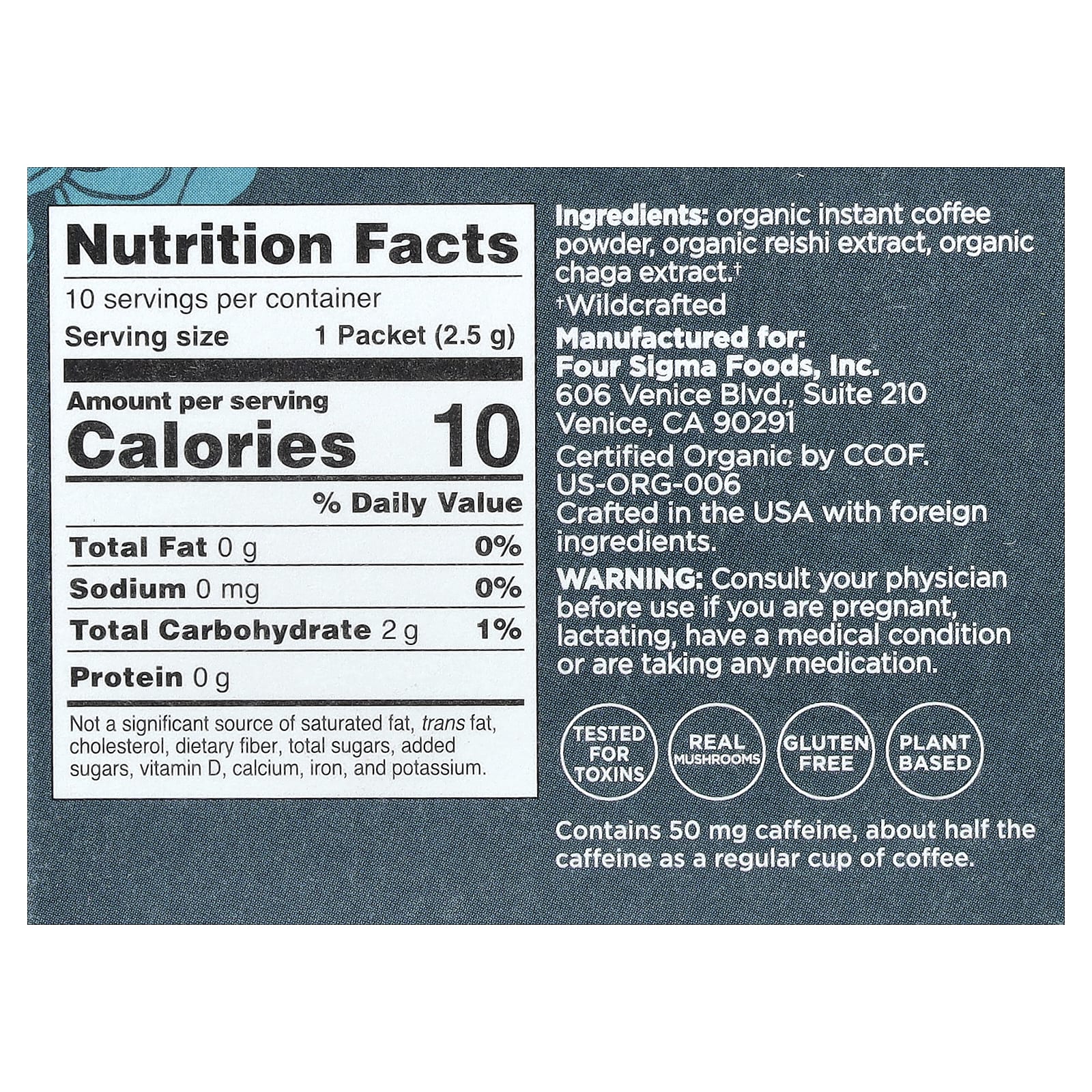 Содержит 50 мг кофеина, примерно половина кофеина, чем в обычной чашке кофе.
