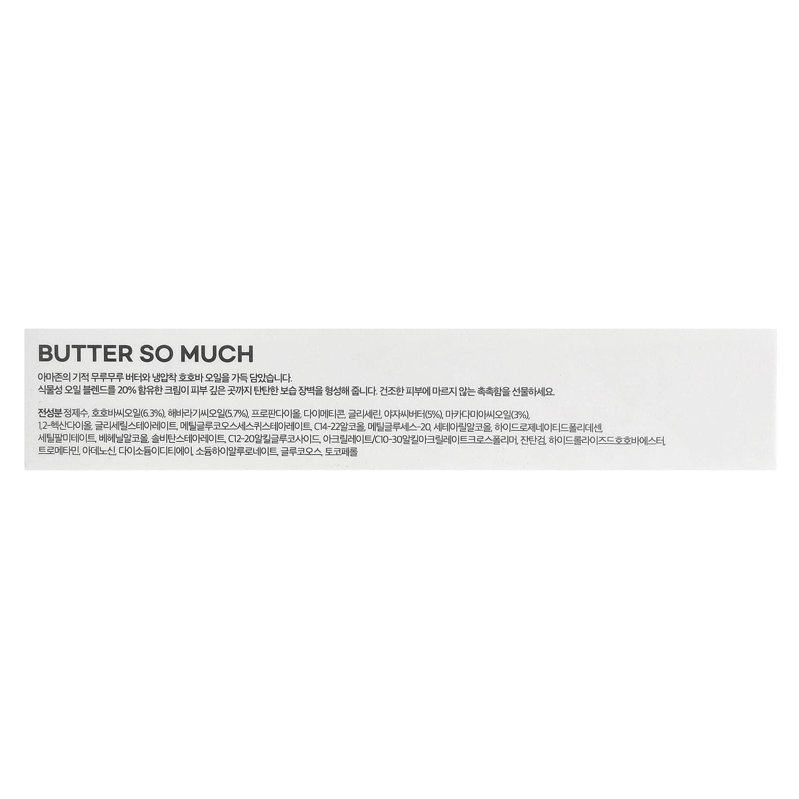 Вода, масло семян жожоба (Simmondsia chinensis) (6,3%), подсолнечное масло (Helianthus annuus) (5,7%), пропандиол, диметикон, глицерин, масло семян мурумуру (Astrocaryum murumuru) (5%), масло семян макадамии (Macadamia ternifolia) (3%), 1,2-гександиол, глицерил стеарат, метилглюкозы сесквистеарат, c14-22 спирты, метил глюцет-20, цетеариловый спирт, гидрогенизированный полидецен, цетил пальмитат, бегениловый спирт, сорбитан стеарат, c12-20 алкил глюкозид, акрилат/c10-30 алкил акрилат кроссполимер, ксантановая камедь, гидролизованные эфиры жожоба, трометамин, аденозин, двунатриевая ЭДТК, гиалуронат натрия, глюкоза, токоферол.