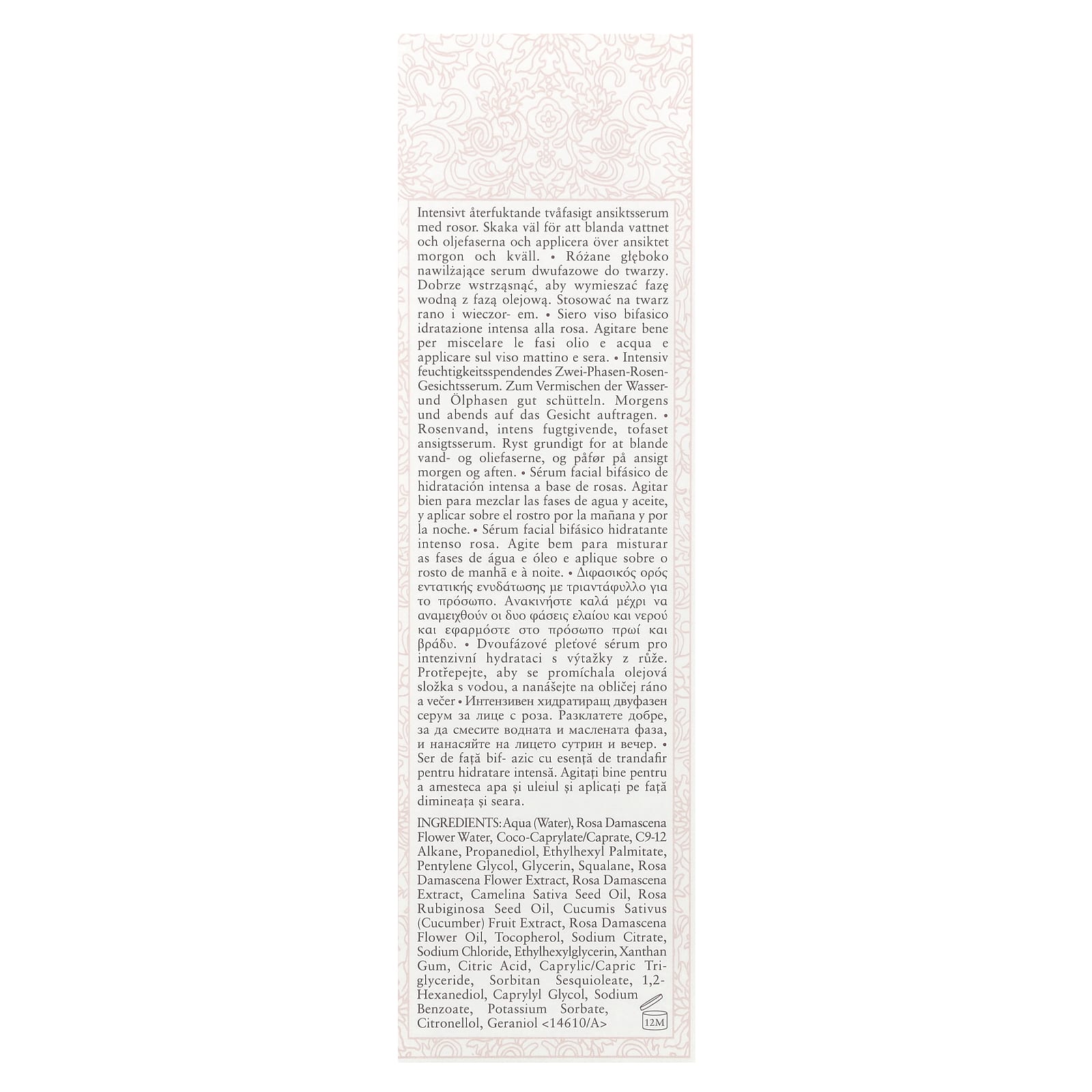 Вода, вода из цветков дамасской розы, кококаприлат / капрат, c9-12 алкан, пропандиол, этилгексил пальмитат, пентиленгликоль, глицерин, сквалан, экстракт цветков дамасской (Rosa damascena), экстракт дамасской розы, масло семян камелины сативы, масло из семян роза (Rosa rubiginosa), экстракт плодов огурца (Cucumis sativus), масло из цветков дамасской розы, токоферол, цитрат натрия, хлорид натрия, этилгексилглицерин, ксантановая камедь, лимонная кислота, каприловый / каприновый триглицерид, сорбитан сесквиолеат, 1,2-гександиол, каприлил гликоль, бензоат натрия, сорбат калия, цитронеллол, гераниол.