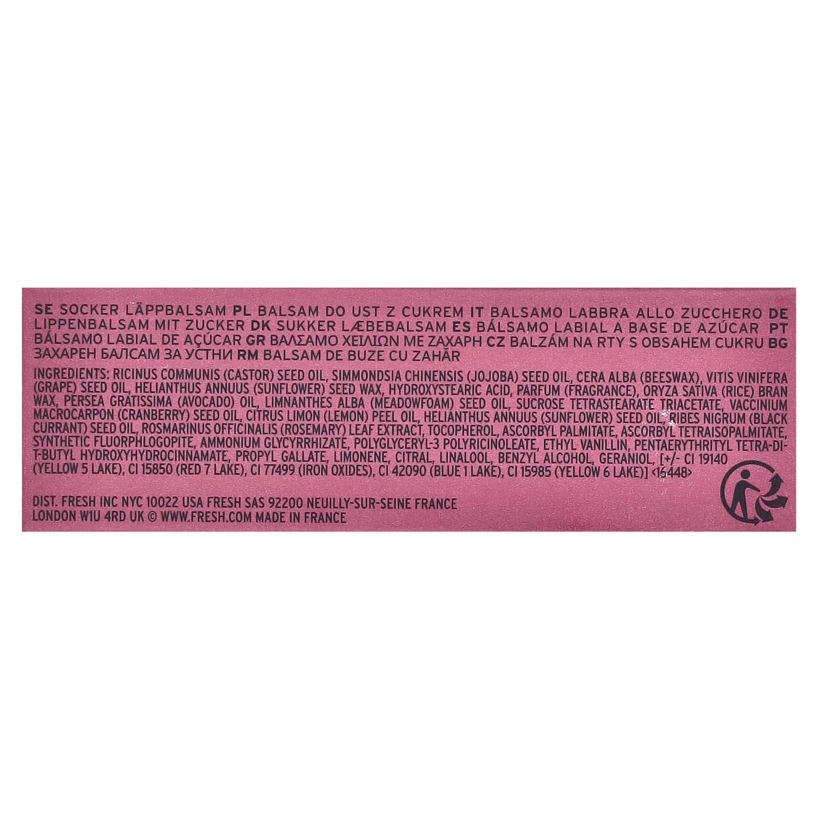 Касторовое масло (Ricinus communis), масло из семян жожоба (Simmondsia chinensis), пчелиный воск, масло из виноградных косточек (Vitis vinifera), воск из семян подсолнечника (Helianthus annuus), гидроксистеариновая кислота, парфюмерная композиция (отдушка), воск из рисовых отрубей (Oryza sativa), масло авокадо (Persea gratissima), масло из семян пенника лугового (Limnanthes alba), тетрастеарат триацетат сахарозы, масло из семян клюквы (Vaccinium macrocarpon), масло из цедры лимона (Citrus limon), подсолнечное масло (Helianthus annuus), масло из косточек черной смородины (Ribes nigrum), экстракт листьев розмарина (Rosmarinus officinalis), токоферол, аскорбил пальмитат, аскорбил тетраизопальмитат, синтетический фторфлогопит, аммония глицирризат, полиглицерил-3-полирицинолеат, этилванилин, пентаэритритил тетра-ди-трет-бутил гидроксигидроциннамат, пропилгаллат, лимонена, цитраль, линалоол, бензиловый спирт, гераниола, [+/- CI 19140 (желтый 5 лак), краситель красный 7 лак (CI 15850), оксиды железа (CI 77499), краситель синий 1 лак (CI 42090), краситель желтый 6 лак (CI 15985)].