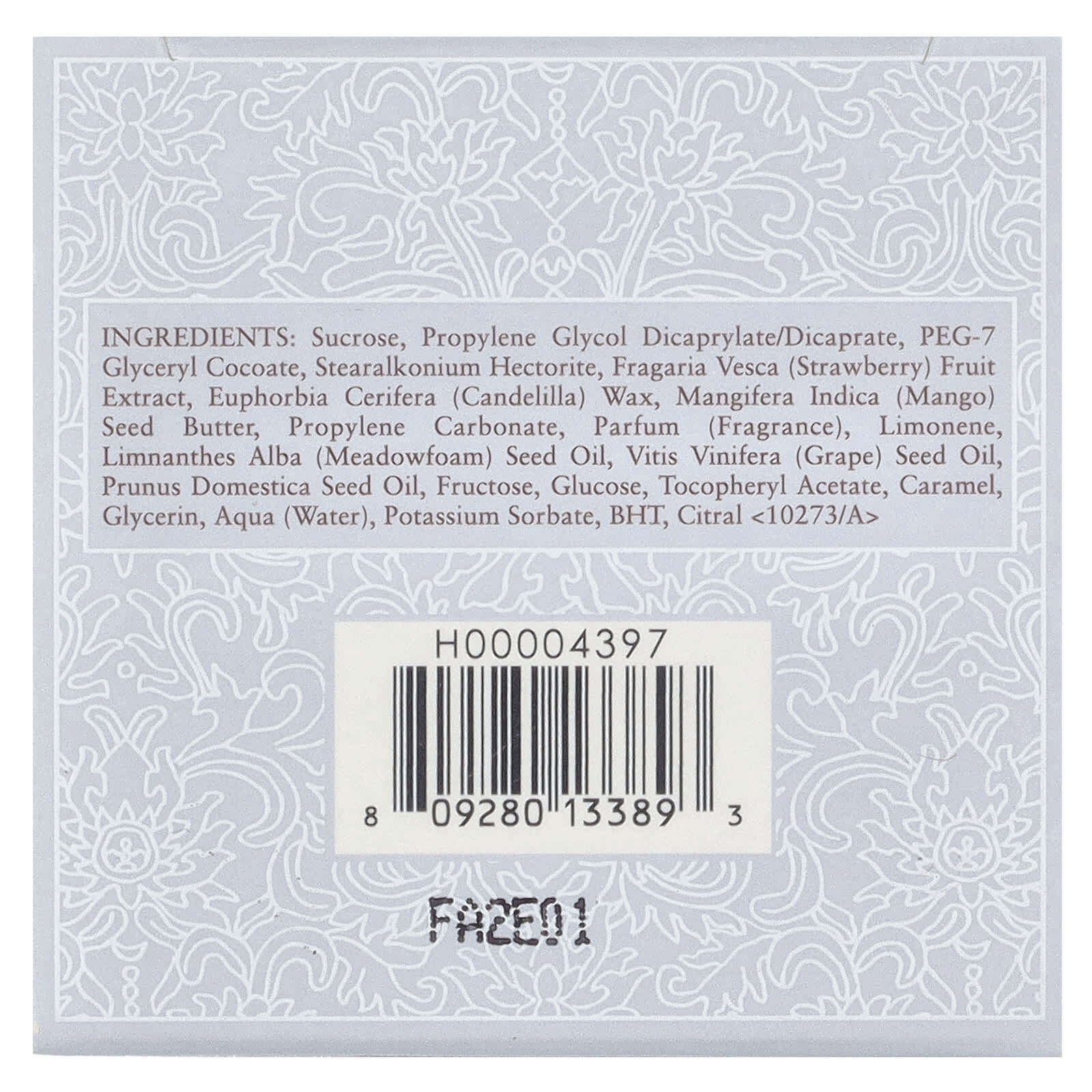 сахароза, пропиленгликоль дикаприлат/дикапрат, ПЭГ-7 глицерил кокоат, стеаралкония гекторит, экстракт клубники (Fragaria vesca), канделильский воск (Euphorbia cerifera), масло из косточек манго (Mangifera indica), пропиленкарбонат, парфюмерная композиция (отдушка), лимонена, масло из семян пенника лугового (Limnanthes alba), масло из виноградных косточек (Vitis vinifera), масло из сливовых косточек (Prunus domestica), фруктоза, глюкоза, токоферилацетат, карамель, глицерин, вода (Aqua), сорбат калия, бутилгидрокситолуол, цитраль.