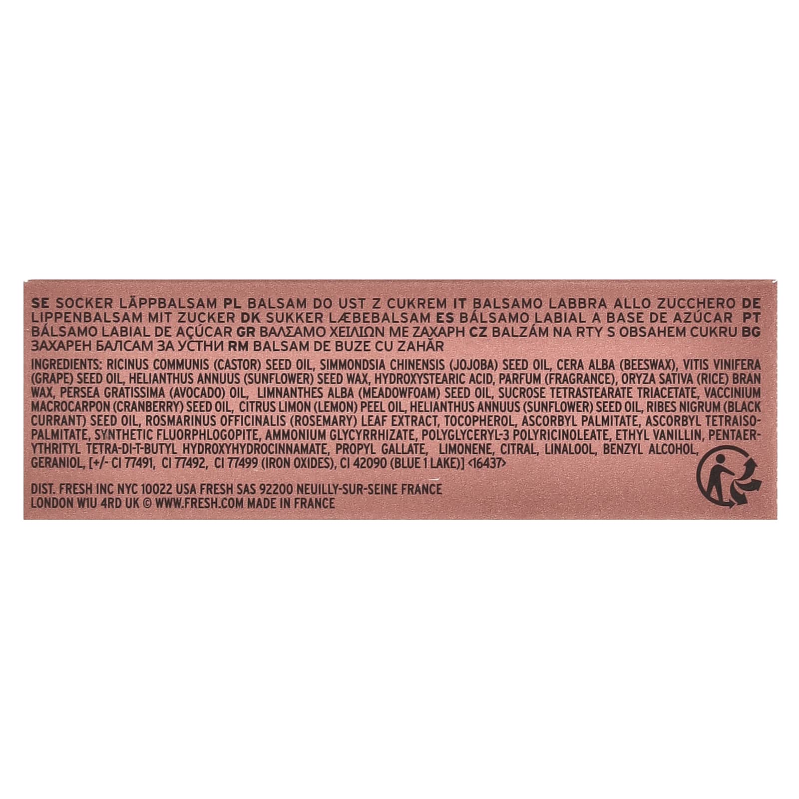 Касторовое масло (Ricinus communis), масло семян жожоба (Simmondsia chinensis), пчелиный воск (Cera alba), Vitis vinifera (масло из виноградных косточек), воск из семян подсолнечника (Helianthus annuus), гидроксистеариновая кислота, парфюмерная композиция (отдушка), воск из рисовых отрубей (Oryza sativa), масло авокадо (Persea gratissima), масло из семян пенника лугового (Limnanthes alba), тетрастеарат триацетат сахарозы, масло семян клюквы (Vaccinium macrocarpon), масло из цедры лимона (Citrus limon), подсолнечное масло, масло семян черной смородины (Ribes nigrum), экстракт листьев розмарина (Rosmarinus officinalis), токоферол, аскорбил пальмитат, аскорбил тетраизопальмитат, синтетический фторфлогопит, глицирризат аммония, полиглицерил-3 полирицинолеат, этил ванилин, пентаэритритил тетра-ди-трет-бутил гидроксигидроциннамат, пропилгаллат, лимонен, цитраль, линалоол, бензиловый спирт, гераниол, [+/- CI 77491, CI 77492, CI 77499 (оксиды железа), CI 42090 (Blue 1 Lake)] & amp; lt; 16437 & amp; gt ;.