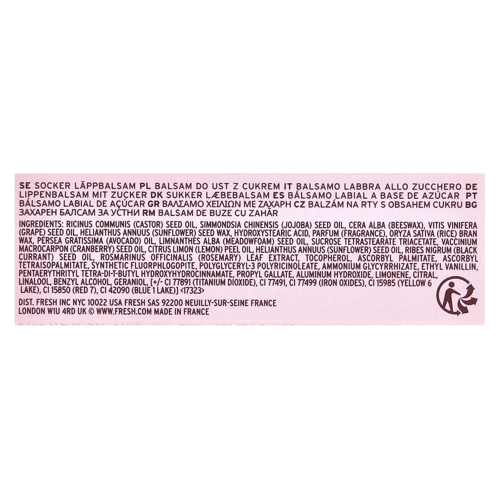 Касторовое масло (Ricinus communis), масло семян жожоба (Simmondsia chinensis), пчелиный воск (Cera alba), Vitis vinifera (масло из виноградных косточек), воск из семян подсолнечника (Helianthus annuus), гидроксистеариновая кислота, парфюмерная композиция (отдушка), воск из рисовых отрубей (Oryza sativa), масло авокадо (Persea gratissima), масло из семян пенника лугового (Limnanthes alba), тетрастеарат триацетат сахарозы, масло семян клюквы (Vaccinium macrocarpon), масло из цедры лимона (Citrus limon), подсолнечное масло, масло семян черной смородины (Ribes nigrum), экстракт листьев розмарина (Rosmarinus officinalis), токоферол, аскорбил пальмитат, аскорбил тетраизопальмитат, синтетический фторфлогопит, полиглицерил-3 полирицинолеат, глицирризат аммония, этил ванилин, пентаэритритил тетра-ди-трет-бутил гидроксигидроциннамат, пропилгаллат, гидроксид алюминия, лимонен, цитраль, линалоол, бензиловый спирт, гераниол, [+/- CI 77891 (диоксид титана), CI 77491, CI 77499 (оксиды железа), CI 15985 (желтый 6 лак), CI 15850 (красный 7), CI 42090 (Blue 1 Lake)].