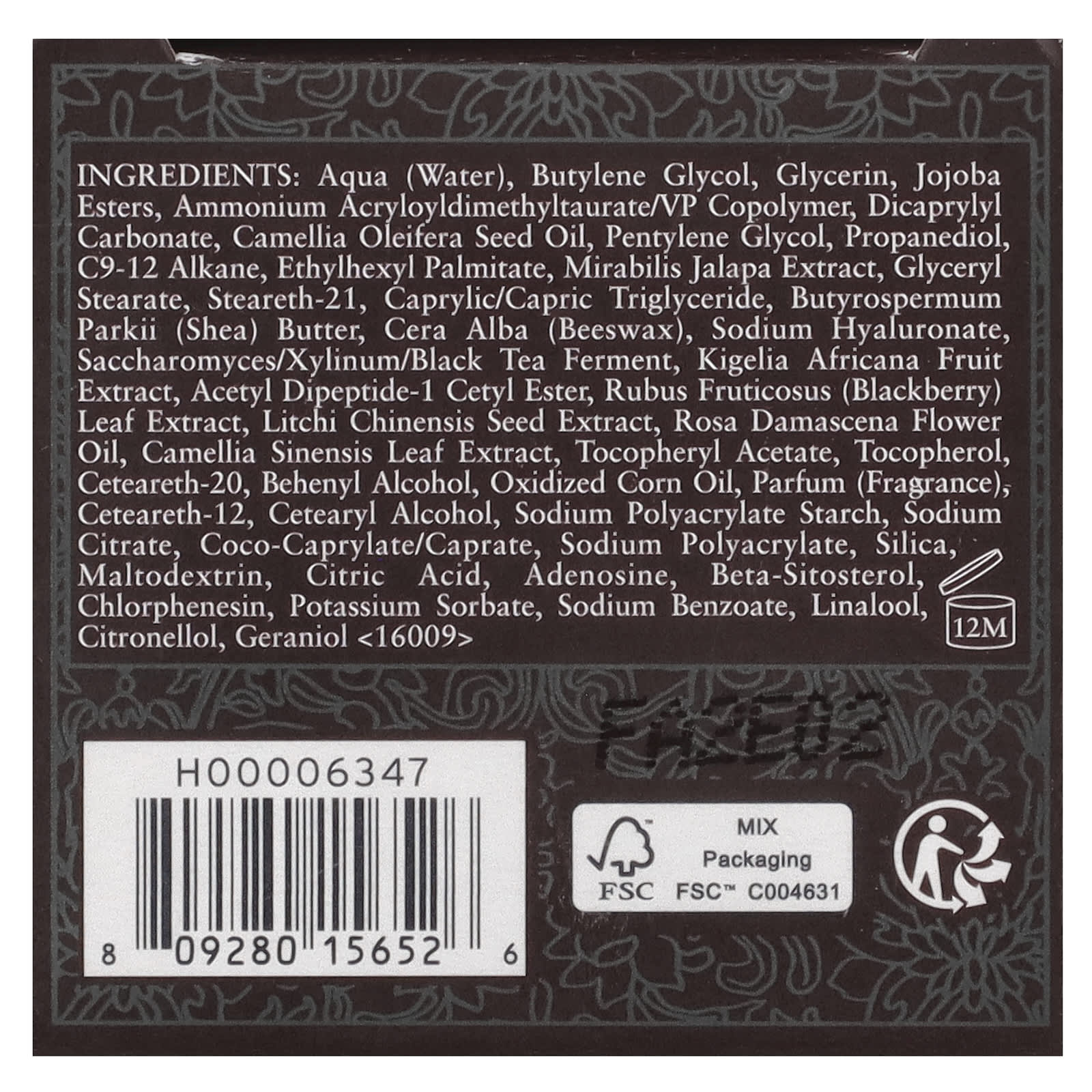 Вода, бутиленгликоль, глицерин, эфиры жожоба, аммоний акрилоилдиметилтаурат/ВП сополимер, дикаприлил карбонат, масло из семян камелии масличной (Camellia oleifera), пентилен гликоль, пропандиол, алкан c9-12, этилгексил пальмитат, экстракт мирабилис халапа, глицерил стеарат, стеарет-21, каприловый/каприновый триглицерид, масло ши (Butyrospermum parkii), пчелиный воск, гиалуронат натрия, сахаромицеты / ксилин / черный чай, экстракт плодов кигелии африканской, ацетил дипептид-1 цетиловый эфир, экстракт листьев ежевики (rubus fruticosus), экстракт семян личи китайского (Litchi chinensis), масло из цветков дамасской розы, экстракт листьев зеленого чая (Camellia sinensis), токоферилацетат, токоферол, цетеарет-20, бегениловый спирт, окисленное кукурузное масло, парфюмерная композиция (отдушка), цетеарет-12, цетеариловый спирт, полиакрилат натрия крахмал, цитрат натрия, коко-каприлат/капрат, полиакрилат натрия, диоксид кремния, мальтодекстрин, аденозин лимонной кислоты, бета-ситостерол, хлорфенезин, сорбат калия, бензоат натрия, линалоол, цитронеллола, гераниол.