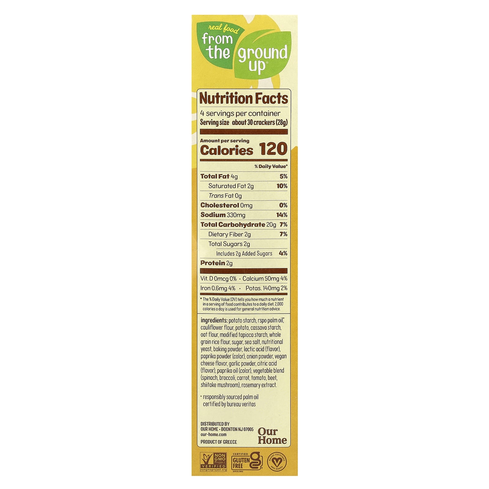 Картофельный крахмал, пальмовое масло RSPO*, Мука из цветной капусты, картофеля, маниоковый крахмал, овсяная мука, модифицированный тапиоковый крахмал, цельнозерновая рисовая мука, сахар, морская соль, пищевых дрожжей, разрыхлитель, молочная кислота (ароматизатор), порошок из паприки (краситель), луковый порошок, ароматизатор «Веганский сыр», чесночный порошок, лимонная кислота (ароматизатор), масло паприки (краситель), овощная смесь (шпинат, брокколи, морковь, томат, свекла, гриб шиитаке), экстракт розмарина.