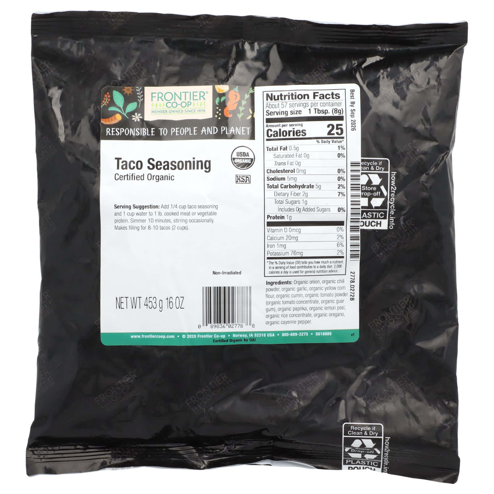 Органическая приправа для тако Frontier Co-op® - это пикантная смесь крепких, насыщенных специй, которые обычно используются для придания вкуса мясу тако и чили, а также многим другим аутентичным мексиканским блюдам. Пряные ингредиенты, используемые для создания нашей премиальной органической приправы для тако, включают перец чили, чеснок, паприку, томат, орегано, кайенский перец и другие ингредиенты, вдохновленные мексиканцами. Эта приправа для сухого тако на 100% органическая, сертифицирована как кошерный и не подвергалась облучению.