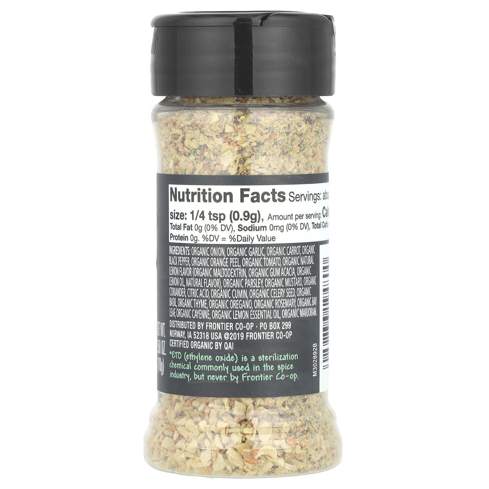 Органический лук, органический чеснок, органическая морковь, органический черный перец, органическая цедра апельсина, органический томат, органический натуральный лимонный ароматизатор (органический мальтодекстрин, органическая аравийская камедь, органическое масло лимона, натуральный ароматизатор), органическая петрушка, органическая горчица, органический кориандр, лимонная кислота, органическая зира, семена органического сельдерея, органический базилик, органический чабрец, органический орегано, органический розмарин, органический лавровый лист; органический кайенский перец, эфирное масло органического лимона, органический майоран.