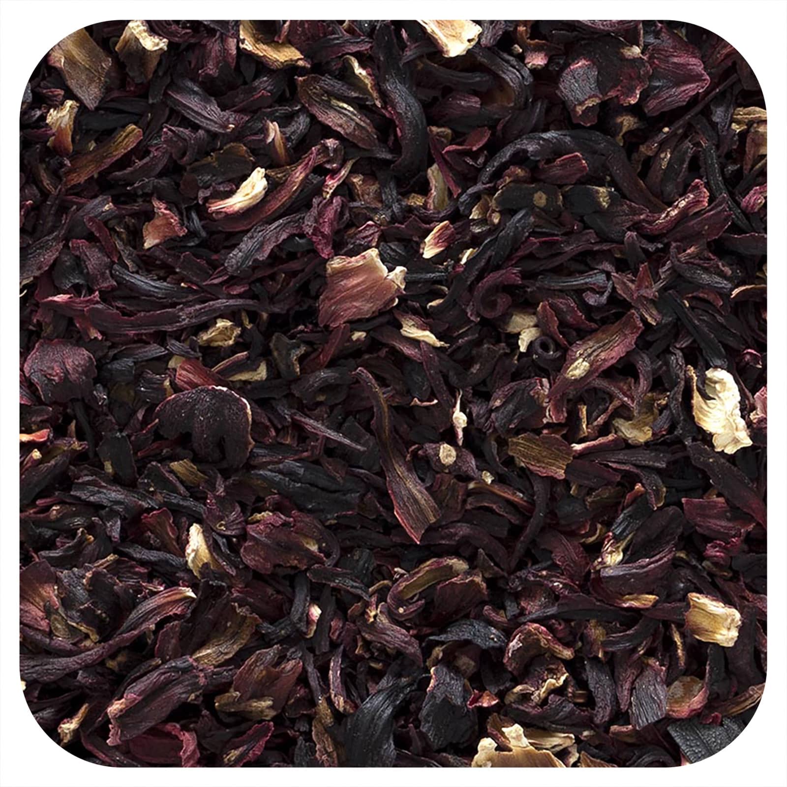 Цветки гибискуса от компании Frontier Co-op собирают вручную и сушат на солнце для получения естественного красного цвета и фруктового вкуса. Тропическое растение используется для приготовления оздоровительного чая, в качестве ингредиента косметики и натурального красителя. Красивые, темно-красные, багряные сушеные цветы придают привлекательный красный цвет чаям, в состав которых они входят.