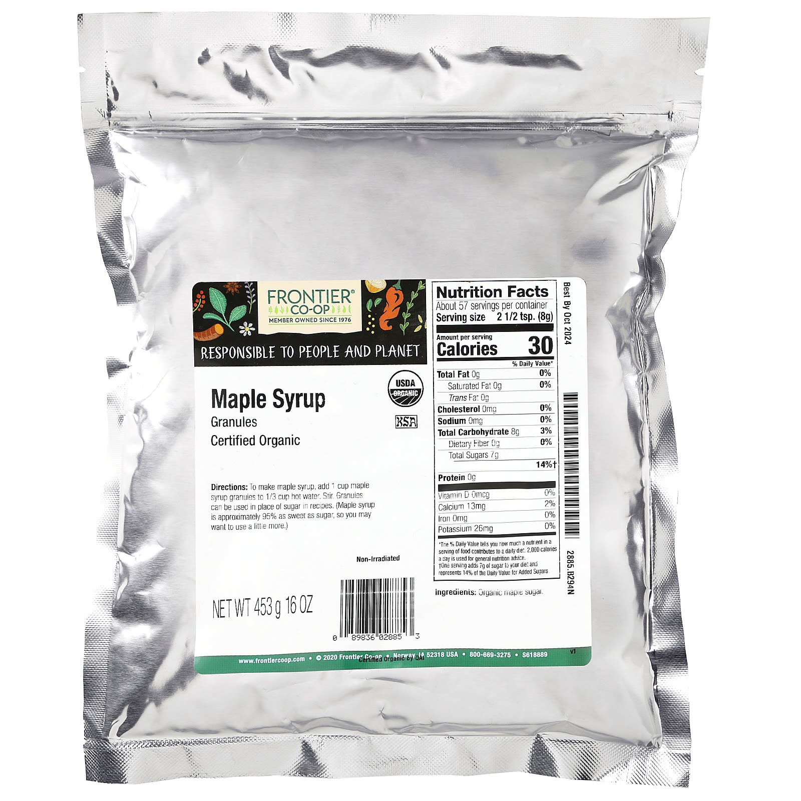 Кленовый сироп Frontier Co-op поставляется в форме гранул и порошка и может использоваться в качестве замены сахара, кленового ароматизатора или кленового сиропа. Он изготовлен из чистого обезвоженного кленового сиропа без добавок и консервантов. Добавляйте гранулы или порошок в горячие напитки, например какао, молочные пирожные, выпечку или смеси из сухофруктов и орехов.