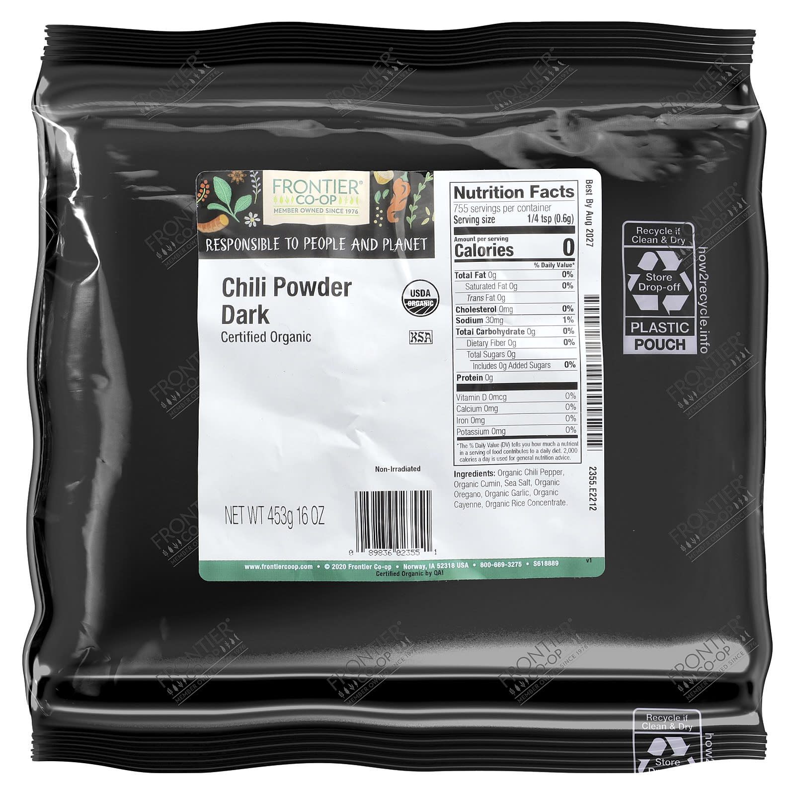 Порошок из органического темного чили Frontier Co-op®, созданный из органической смеси специй, таких как кайенский перец и обжаренный перец чили, сбалансирован с орегано и чесноком. Земляной и богатый с тонкими цветочными, пряными и чесночными нотами.