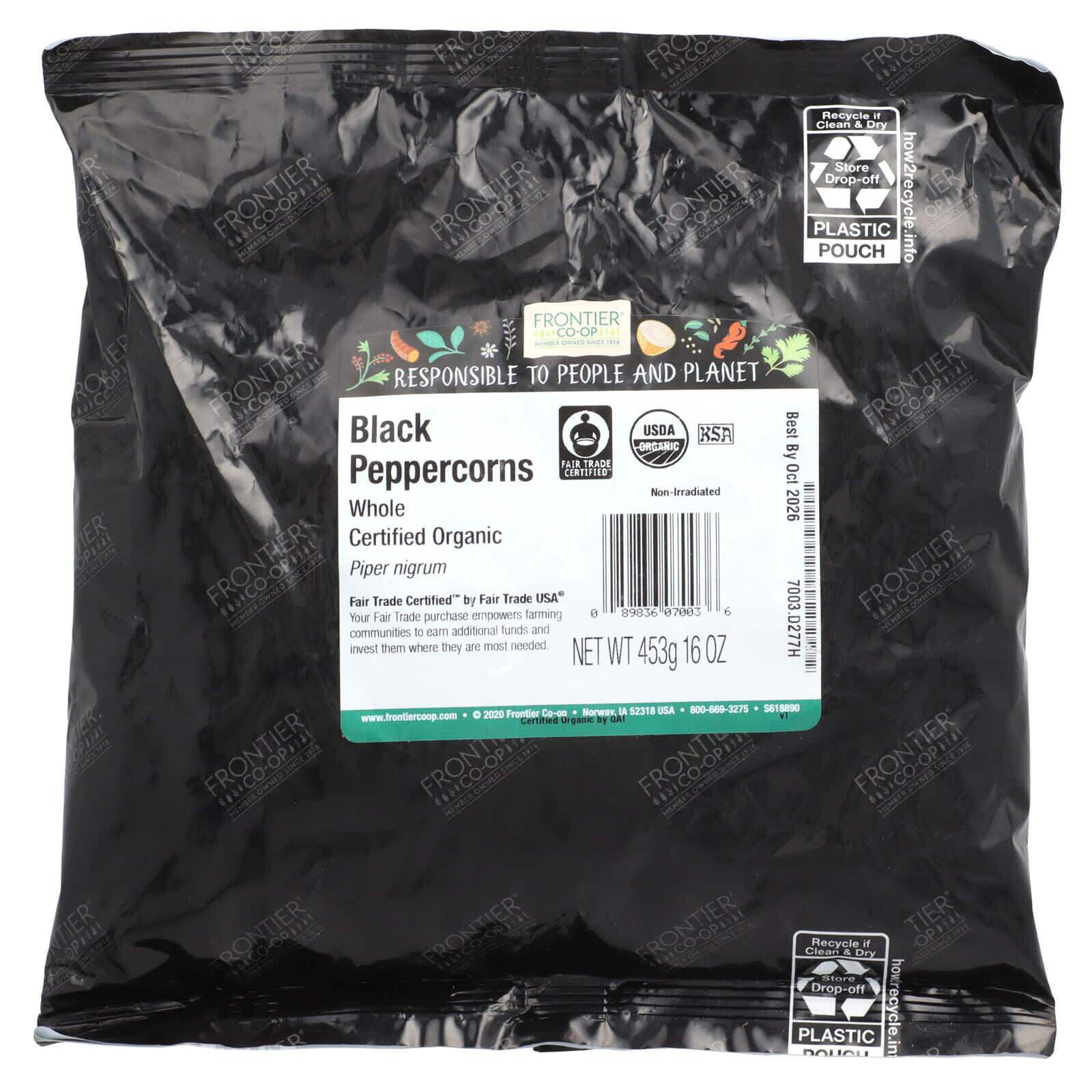 Органический черный перец Frontier Co-op, имеющий сертификат Fair Trade Certified ™, можно перемолоть на мельнице во время приготовления или за столом, чтобы обеспечить приятный жар и вкус практически любого блюда. Черный перец - одна из самых популярных специй в мире. На самом деле это незрелые зеленые плоды (ягоды), высушенные на солнце после ферментации. Эти цельные органические горошины перца тщательно отбираются в ведущих мировых регионах-производителях перца, чтобы обеспечить стабильный размер и премиальное качество. Наш черный перец также сертифицирован как кошерный.