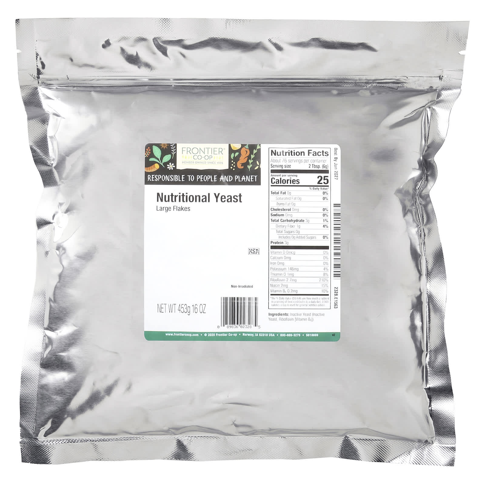 Пищевые дрожжи в больших хлопьях Frontier Co-op® производятся из одноклеточного организма Saccharomyces cerevisi, выращенного на тростниковой и свекольной патоке. Дрожжи собирают, промывают, пастеризуют и сушат при нагревании, чтобы «деактивировать» их. Поскольку он неактивен, он не заквашивается, как пекарские дрожжи, но отлично подходит в качестве приправы и заменителя сыра. Пищевые дрожжи придают ореховый, умами и слегка сырный вкус супам, подливам, соусам и без яиц.