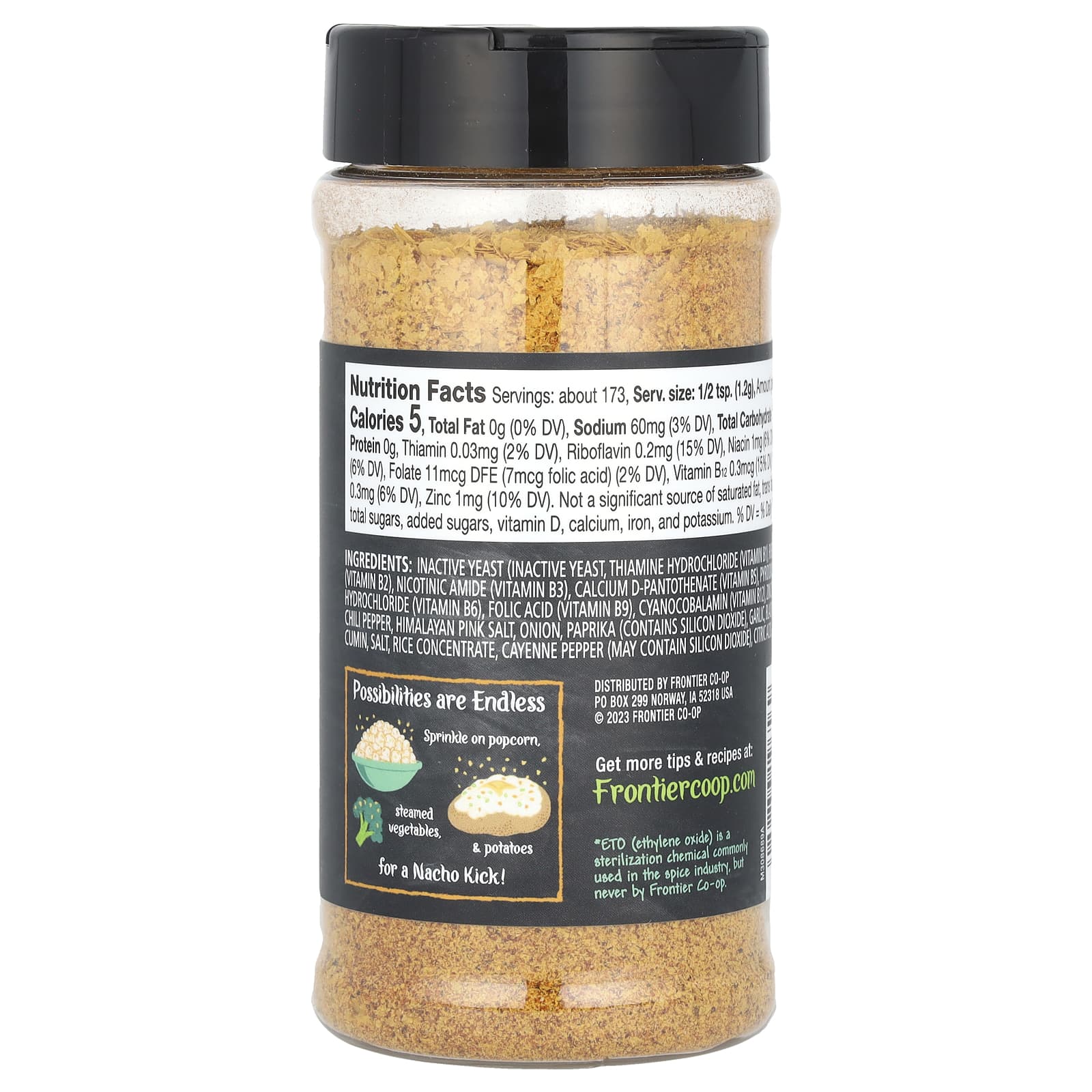 Неактивные дрожжи (неактивные дрожжи, тиамина гидрохлорид (витамин B1), рибофлавин (витамин B2), никотиновый амид (витамин B3), d-пантотенат кальция (витамин B5), пиридоксина гидрохлорид (витамин B6), фолиевая кислота (витамин B9), цианокобаламин (витамин B12), сульфат цинка), перец чили, розовая гималайская соль, лук, паприка (содержит диоксид кремния), чеснок, черный перец, тмин, соль, рисовый концентрат, кайенский перец (может содержать диоксид кремния), лимонная кислота.
