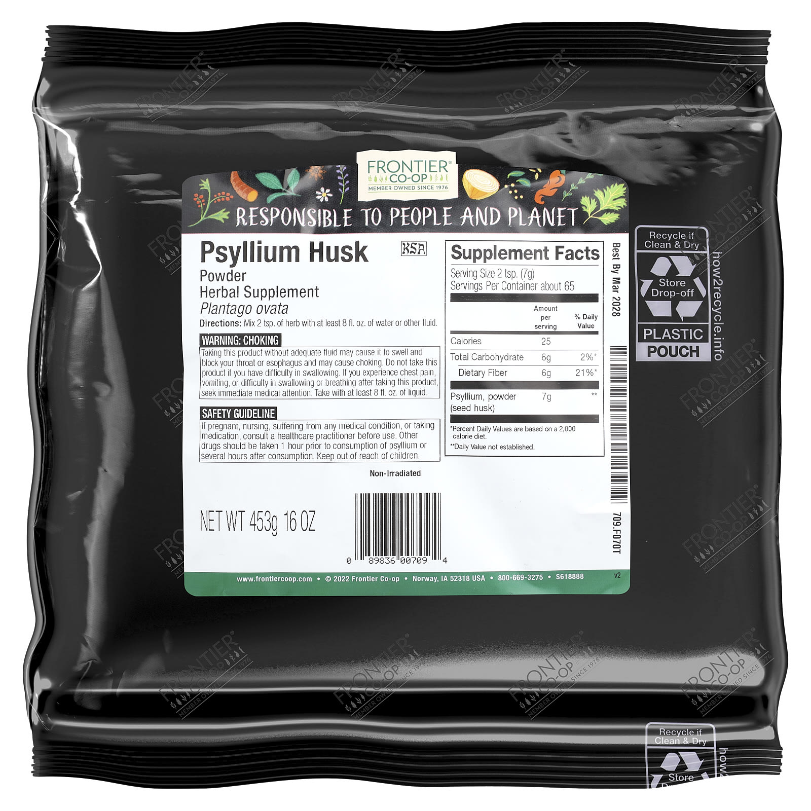 Подорожник Frontier®, также известный как подорожник яйцевидный, — это низкорослое растение, произрастающее в Иране, Пакистане и Индии. Он является основным ингредиентом коммерческих пищевых добавок Metamucil и Citrucel. Подорожник наиболее известен и используется благодаря высокому содержанию слизи. Порошок из шелухи семян подорожника Frontier® хорошо подходит для выпечки, капсулирования и приготовления травяных препаратов. Наш нерасфасованный порошок из шелухи семян подорожника — это сертифицированный кошерный продукт, который не подвергался облучению.