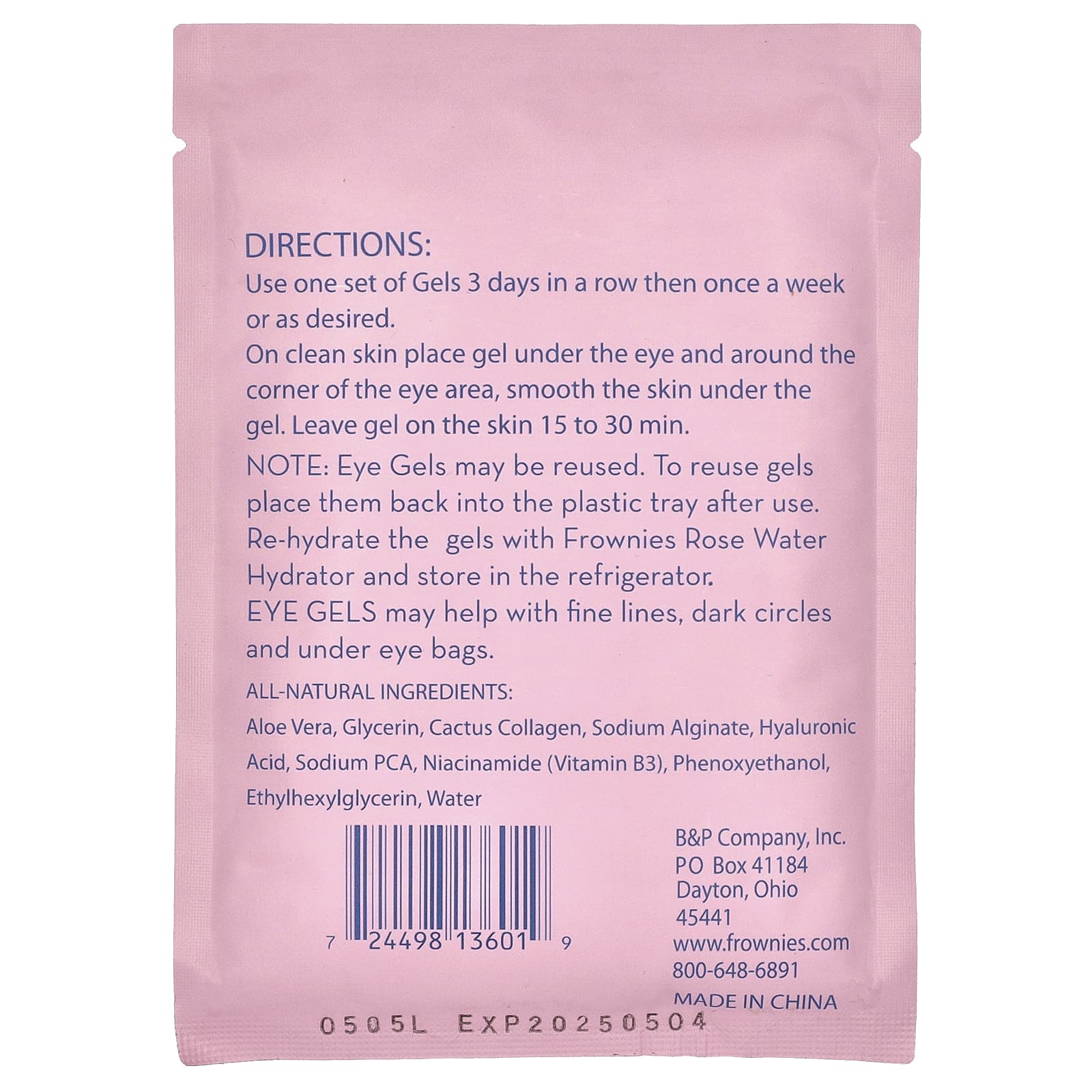 Примечание. Глазные гели можно использовать повторно. Чтобы повторно использовать гели, поместите их обратно в пластиковый лоток после использования. Увлажняйте гели с помощью увлажняющего средства с розовой водой Frownies и храните в холодильнике.