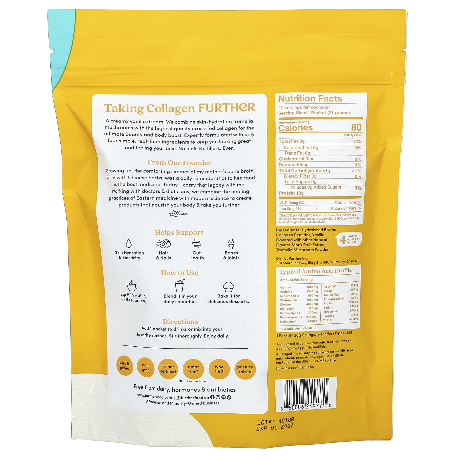 Сливочная ванильная мечта! Мы сочетаем увлажняющие кожу грибы тремелла с коллагеном высочайшего качества, полученным от травяного откорма, для непревзойденной красоты и укрепления тела. Специально разработано всего из четырех простых натуральных пищевых ингредиентов, чтобы вы прекрасно выглядели и чувствовали себя прекрасно. Никакого мусора. Без наполнителей. Никогда.