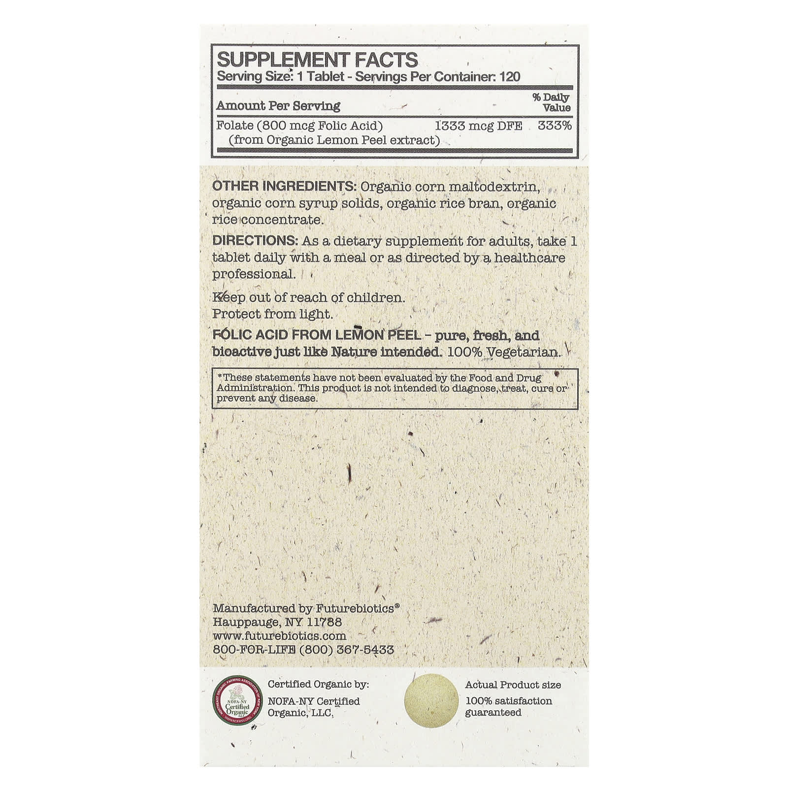 Фолиевая кислота Futurebiotics® сертифицирована как органическая. Фактически, каждый ингредиент в этом продукте без исключения сертифицирован как органический.