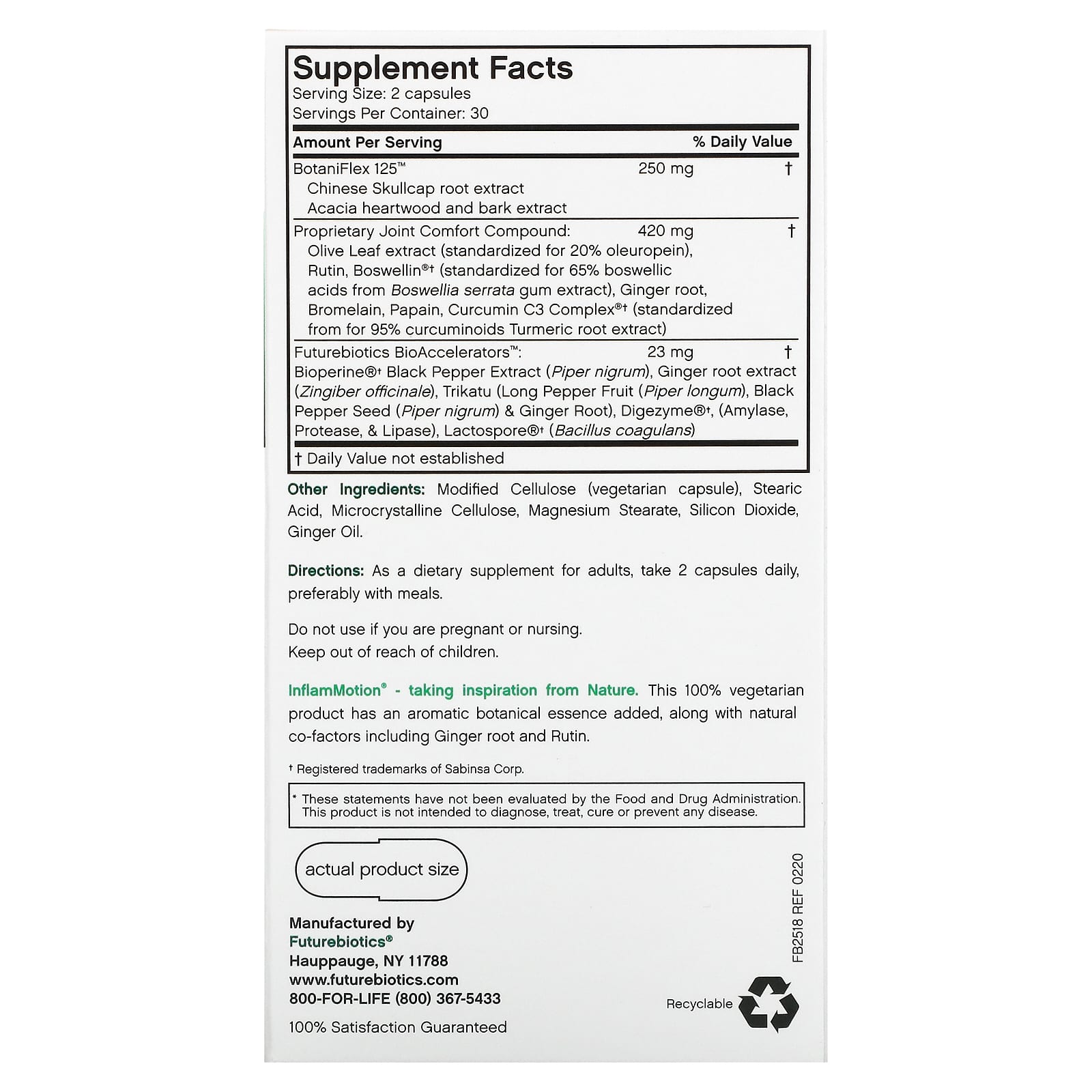 Эффективность InflamMotion усилена с помощью биоакселераторов Futurebiotics. Клинически проверенный экстракт черного перца (piper nigrum) BioPerine улучшает биодоступность питательных веществ, а наш запатентованный натуральный состав из экстракта имбиря, трикату, высокоэффективных комплексов Digezyme и Lactospore улучшает пищеварение и усвоение.