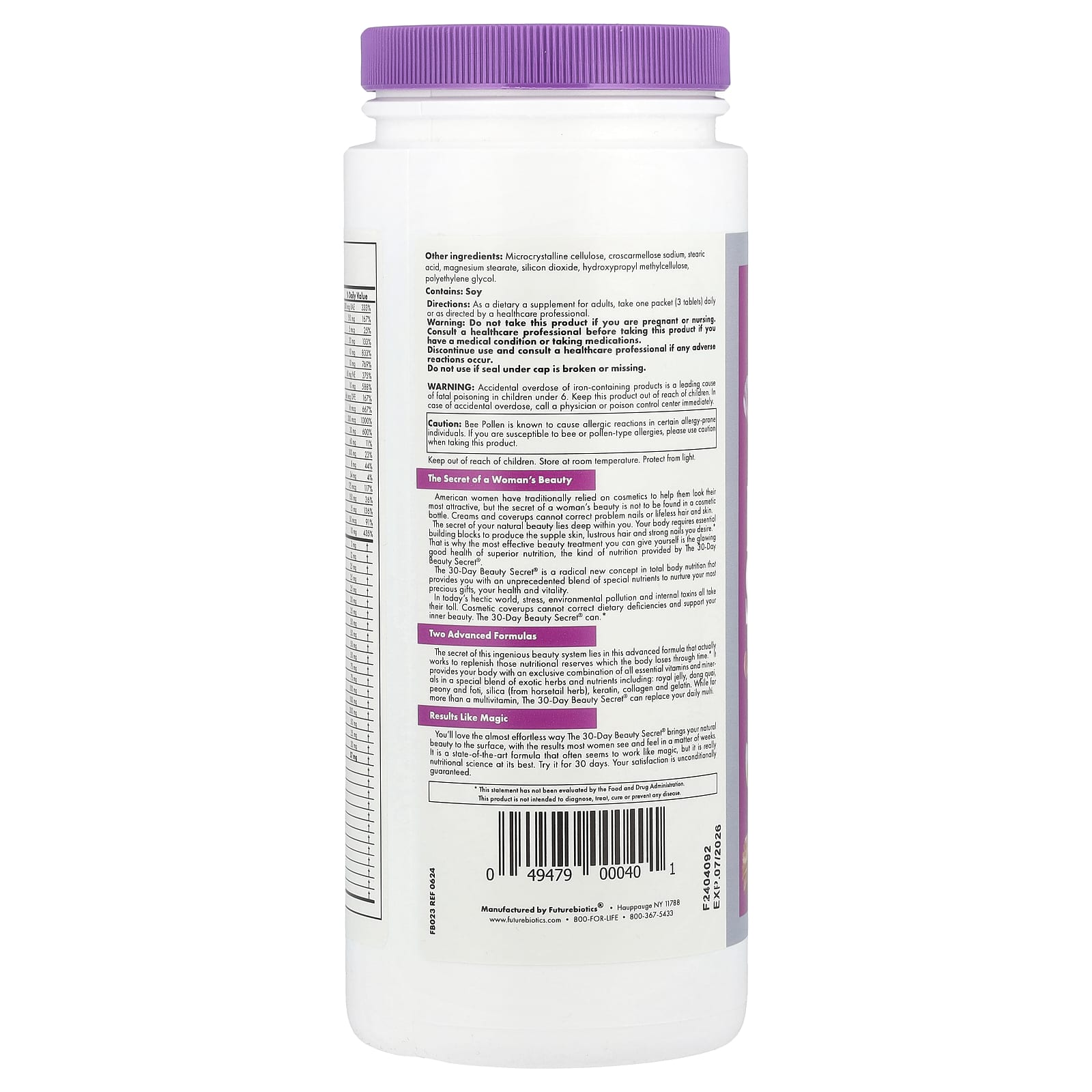 Секрет этой гениальной системы для красоты заключается в ее усовершенствованной формуле, которая фактически работает для восполнения тех питательных запасов, которые организм теряет со временем. Она обеспечивает ваш организм эксклюзивным сочетанием всех необходимых витаминов и минералов в специальной смеси экзотических трав и питательных веществ, включая маточное молочко, дягиль лекарственный, пион, горец многоцветковый, диоксид кремния (из травы хвоща), кератин, коллаген и желатин. The 30-Day Beauty Secret® — это не просто мультивитаминная добавка. Она может восполнить суточную потребность вашего организма в мультивитаминах.