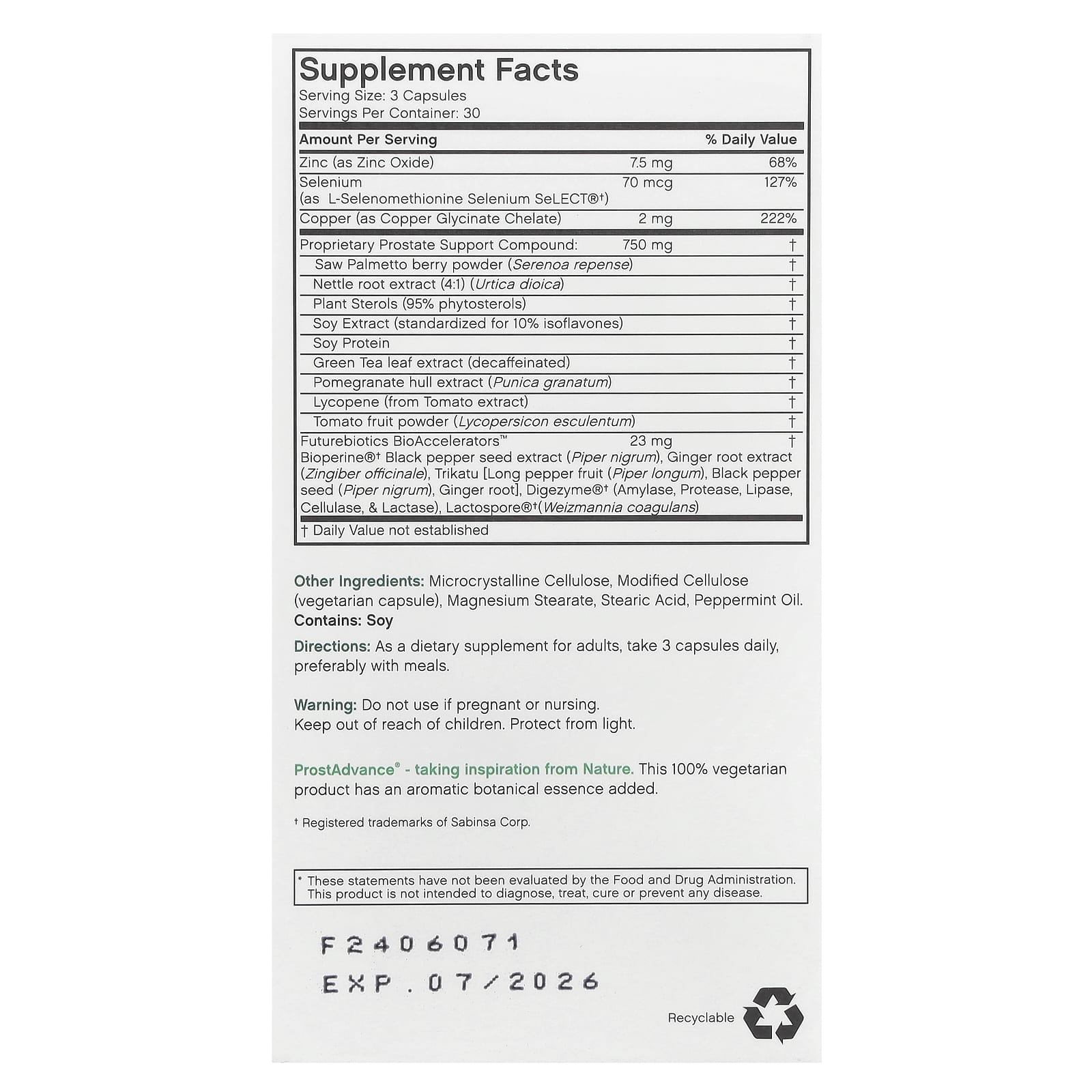 ProstAdvance® усиливает эффективность с помощью Futurebiotics BioAccelerators ™. Клинически изученный экстракт черного перца (Bioperine ™) улучшает биодоступность питательных веществ, а наше запатентованное натуральное соединение из экстракта имбиря, трикату, сверхмощных препаратов Digezyme® и Lactospore® улучшает пищеварение и усвоение.