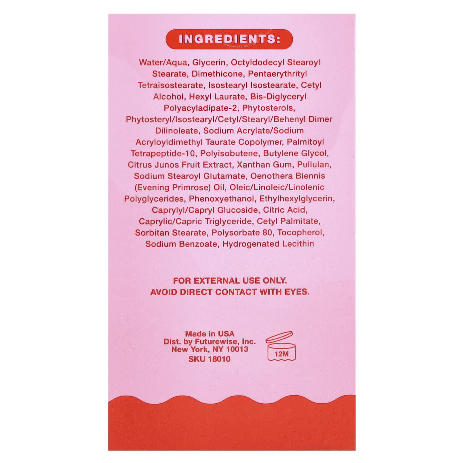 Вода (Aqua), глицерин, октилдодецил стеароил стеарат, диметикон, пентаэритритил тетраизостеарат, изостеарил изостеарат, цетиловый спирт, гексил лаурат, бис-диглицерил полиациладипат-2, фитостеролы, фитостерил / изостеарил / цетил / стеарил / бегенил димер дилинолеат, натрий акрилат/натрий акрилоилдиметилтаурат сополимер, пальмитоил тетрапептид-10, полиизобутен, бутиленгликоль, экстракт плодов юдзу (Citrus junos), ксантановая камедь, пуллулан, натрия стеароил глутамат, масло примулы вечерней (Oenothera biennis), олеиновые/линолевые/линоленовые полиглицериды, феноксиэтанол, этилгексилглицерин, каприлил/каприл глюкозид, лимонная кислота, каприловый/каприновый триглицерид, цетил пальмитат, сорбитан стеарат, полисорбат 80, токоферол, бензоат натрия, гидрогенизированный лецитин.