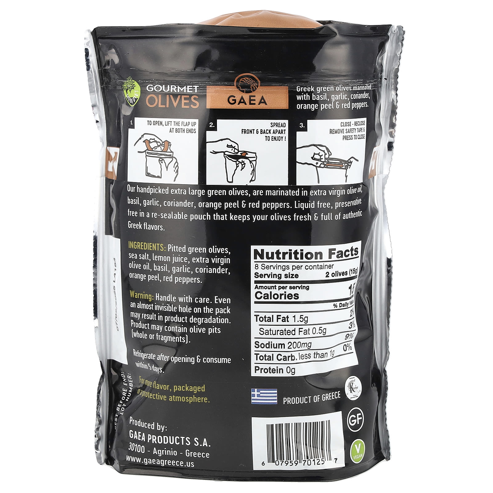 Зеленые оливки собраны вручную и замаринованы с нерафинированным оливковым маслом высшего качества, базиликом, чесноком, кориандром, апельсиновой цедрой и красным перцем. Зеленые оливки, упакованные в защитной среде в герметично закрывающийся пакет, не содержат жидкости, а инновационная упаковка сохраняет оливковое масло свежим и полным подлинных греческих ароматов.