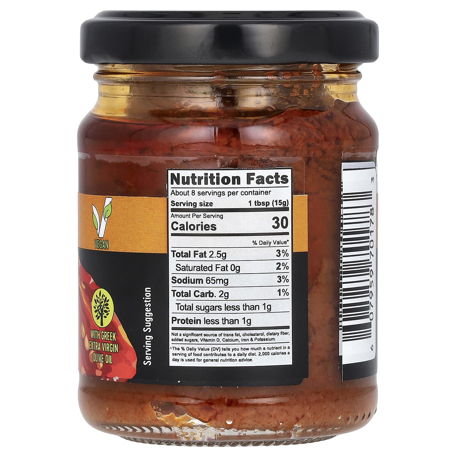 Вода, оливки каламата, сушеный томат, оливковое масло холодного отжима, уксус, яблочный сок из концентрата, соль, луковый порошок, орегано, горчичный порошок.