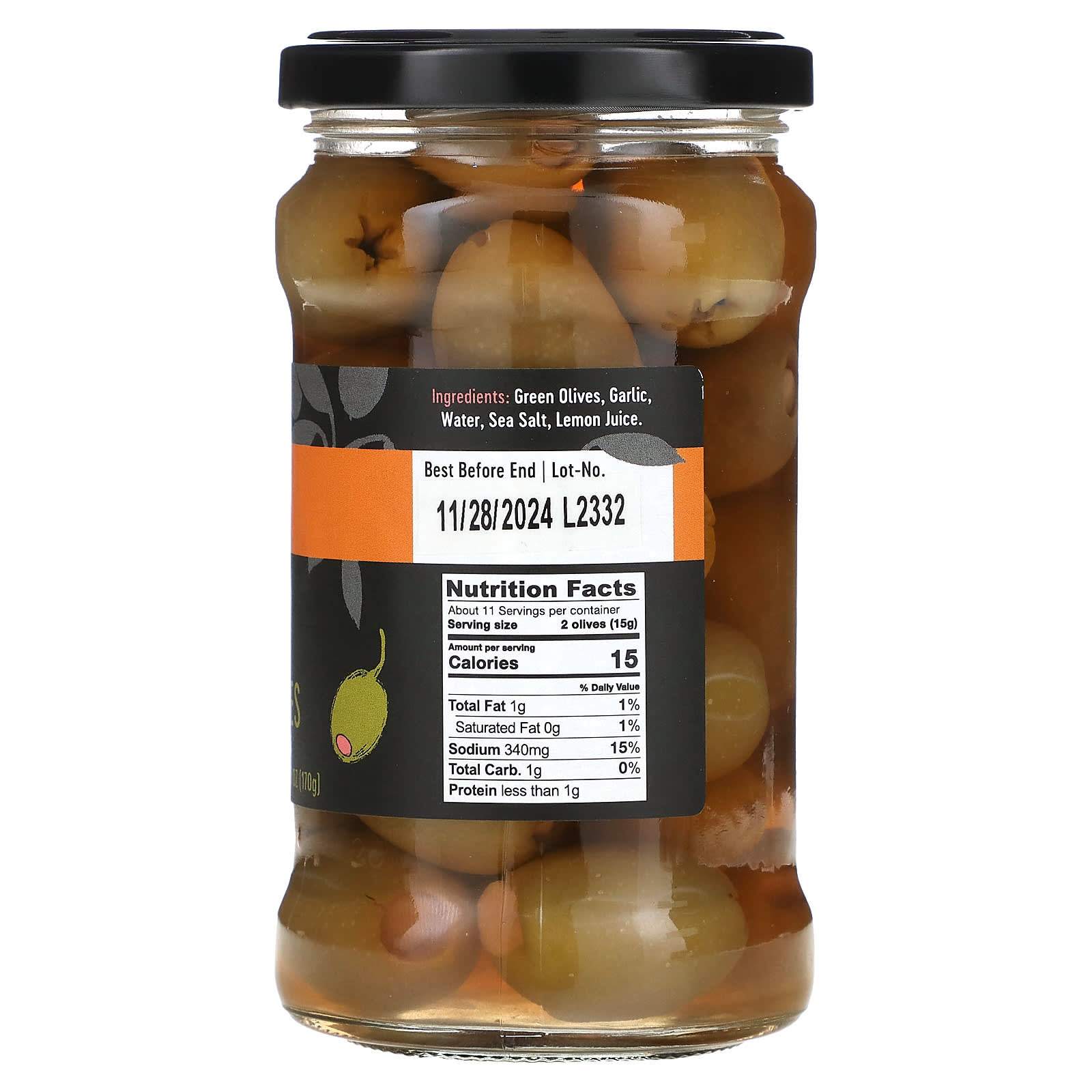 Зеленые оливки Gaea тщательно заправляются целыми зубчиками чеснока.