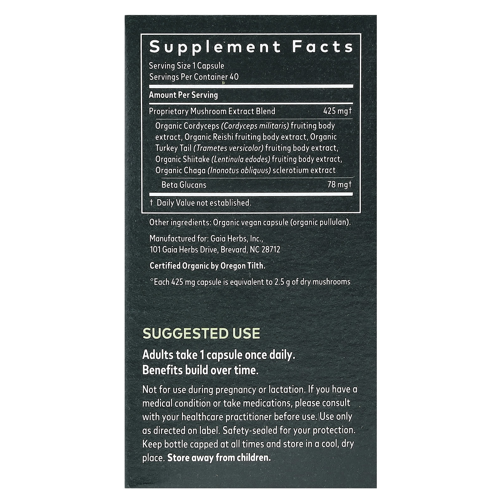 ♦ Каждая капсула (425 мг) эквивалентна 2,5 г сухих грибов.