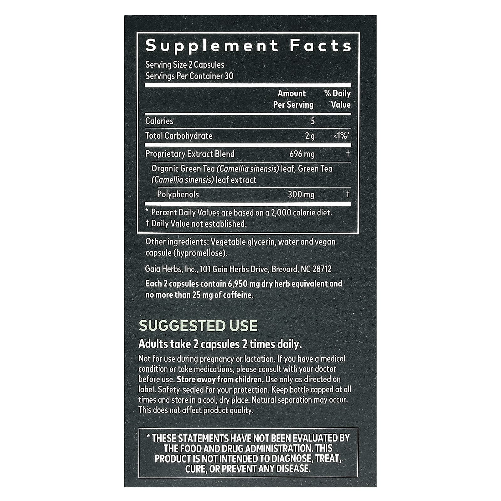 Каждые 2 капсулы содержат 6950 мг эквивалента сухих трав и не более 15 мг кофеина.