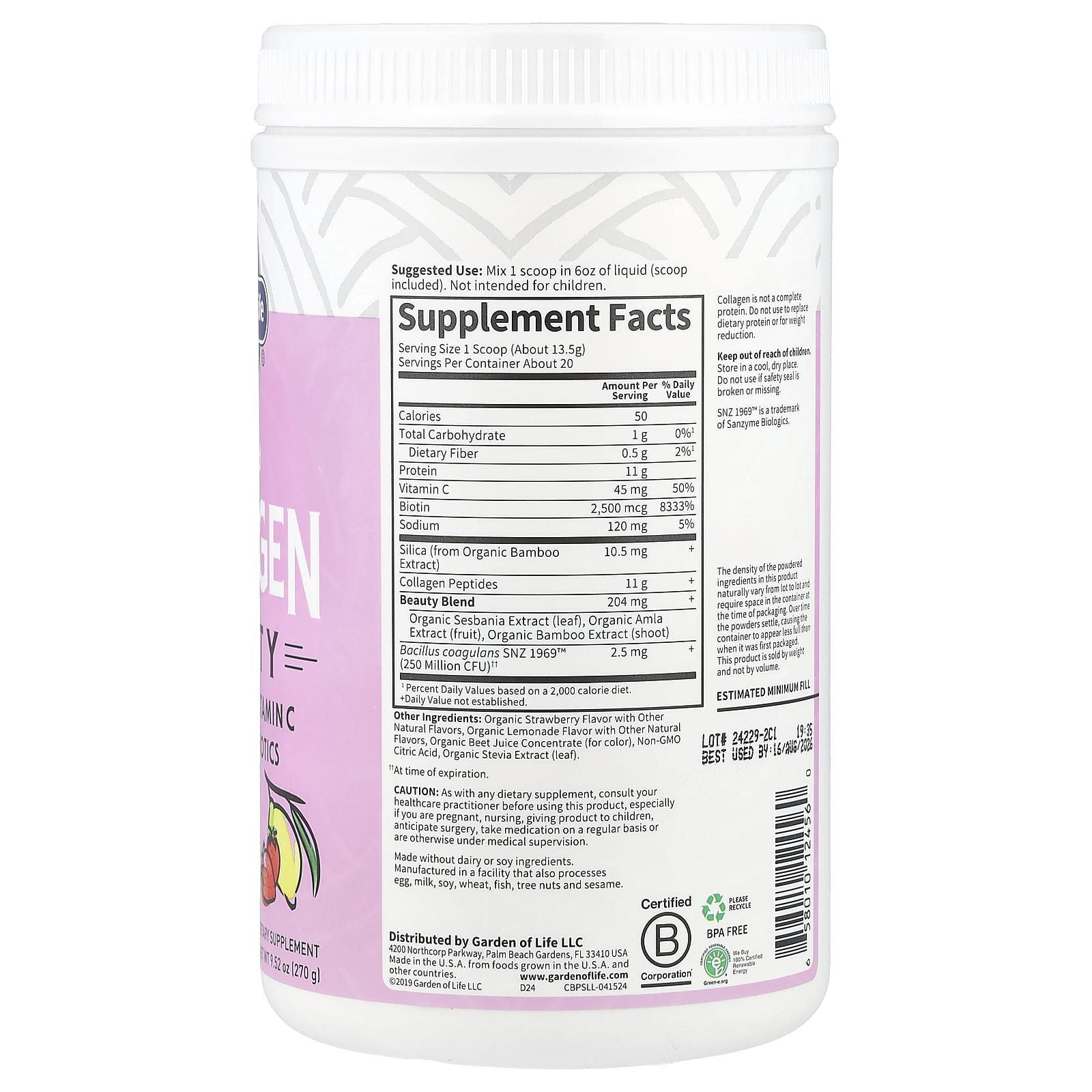 Garden of Life, коллаген от животных травяного откорма, для красоты, клубничный лимонад, 270 г (9,52 унции)