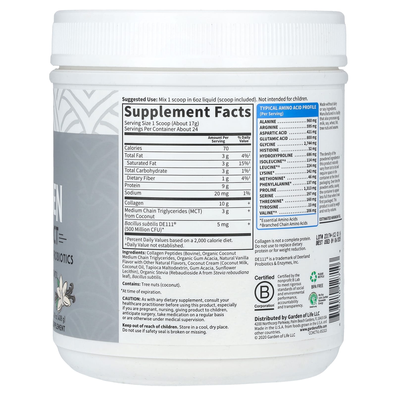 Пептиды коллагена (бычьего), органические среднецепочечные триглицериды из кокоса, органическая аравийская камедь, натуральный ароматизатор «Ваниль» с другими натуральными ароматизаторами, кокосовые сливки (кокосовое молоко, кокосовое масло, тапиока мальтодекстрин, аравийская камедь, подсолнечный лецитин), органическая стевия (ребаудиозид А из листьев стевии (Stevia rebaudiana)), сенная палочка (Bacillus subtilis).