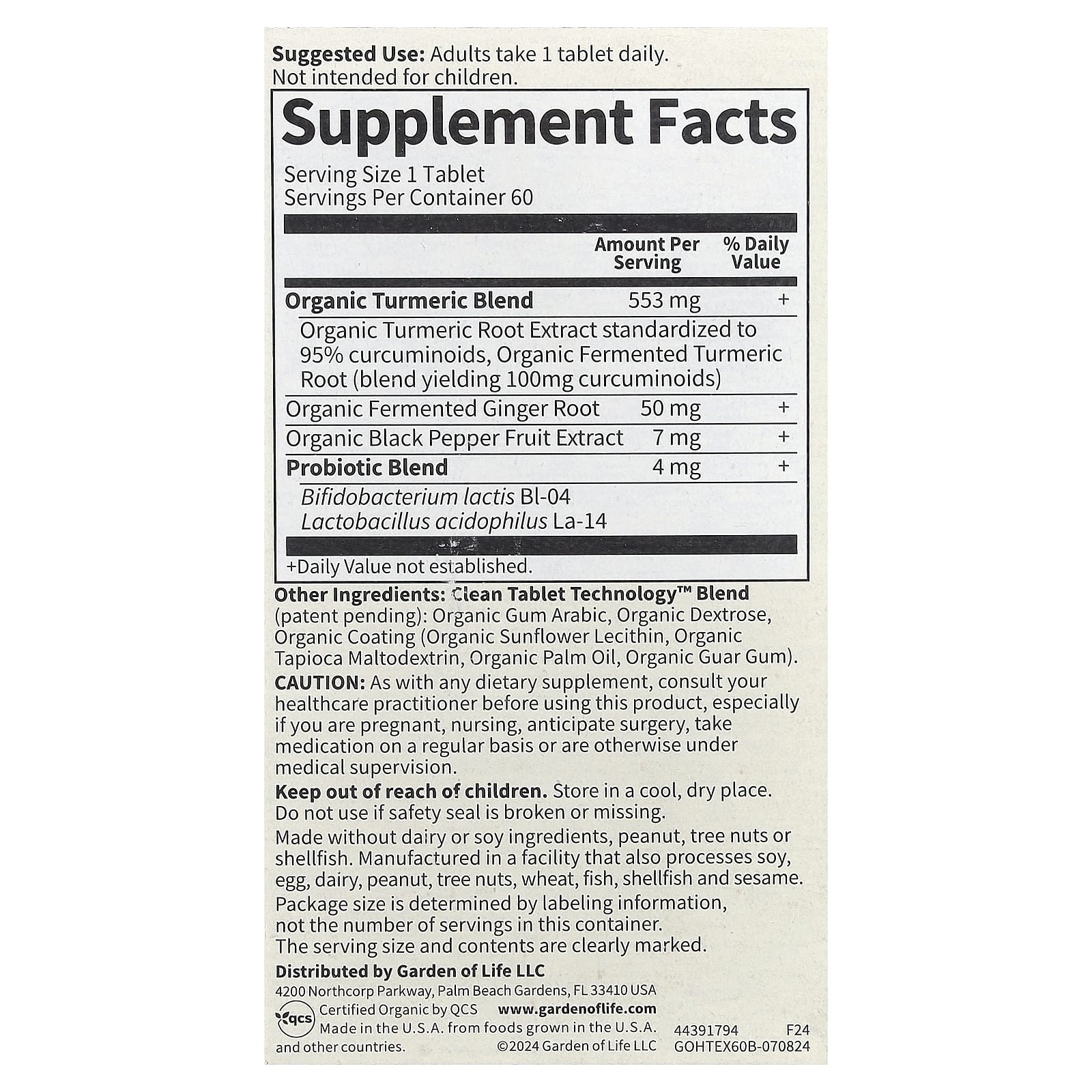 | Смесь из органической куркумы Органический экстракт корня куркумы, стандартизованный до 95% куркуминоидов, органический ферментированный корень куркумы (смесь, содержащая 100 мг куркуминоидов) | 553 мг | + |