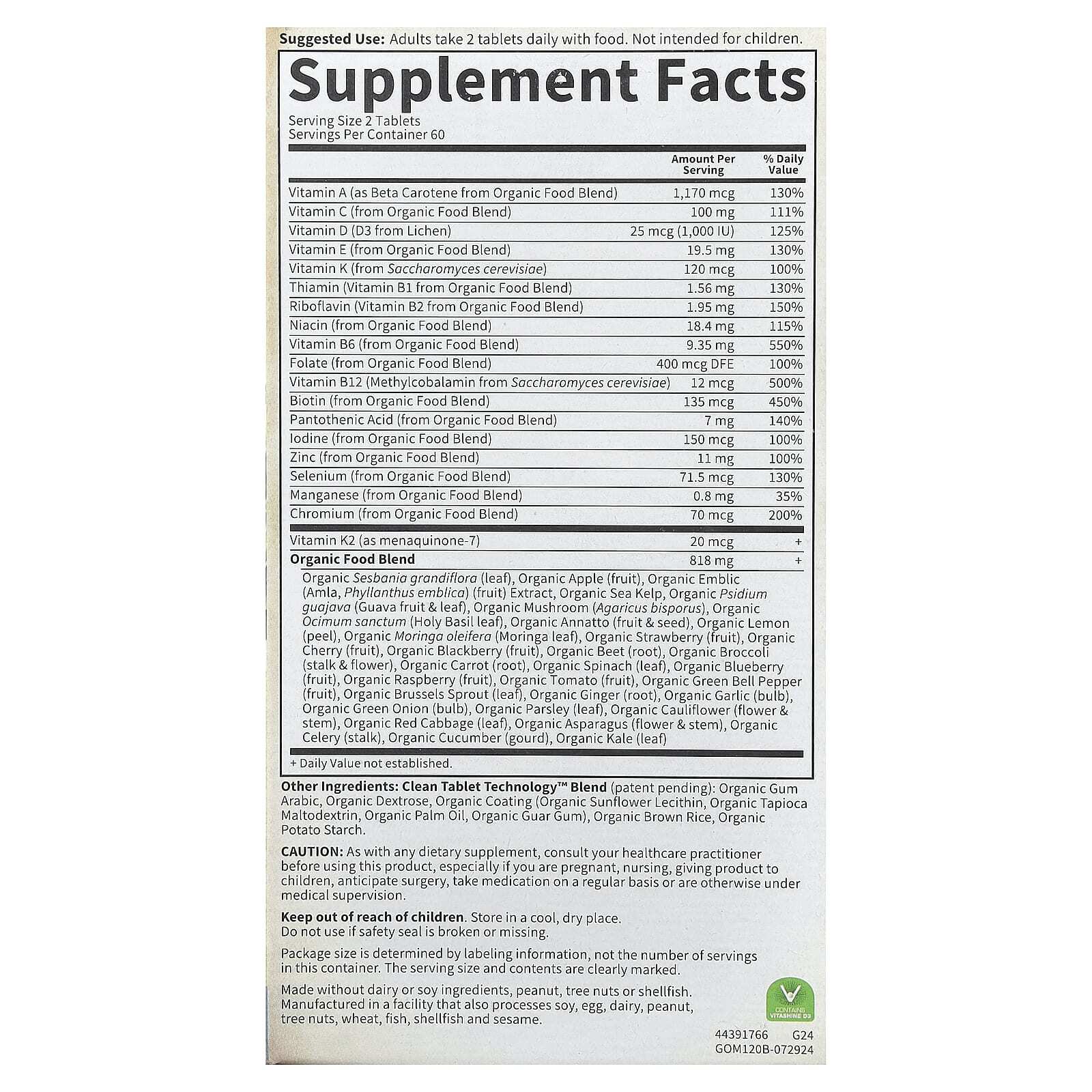 Смесь Clean Tablet Technology™ (в ожидании патента): органическая аравийская камедь, органическая декстроза, органическая оболочка (органический подсолнечный лецитин, органический мальтодекстрин из тапиоки, органическое пальмовое масло, органическая гуаровая камедь), органический коричневый рис, органический картофельный крахмал.