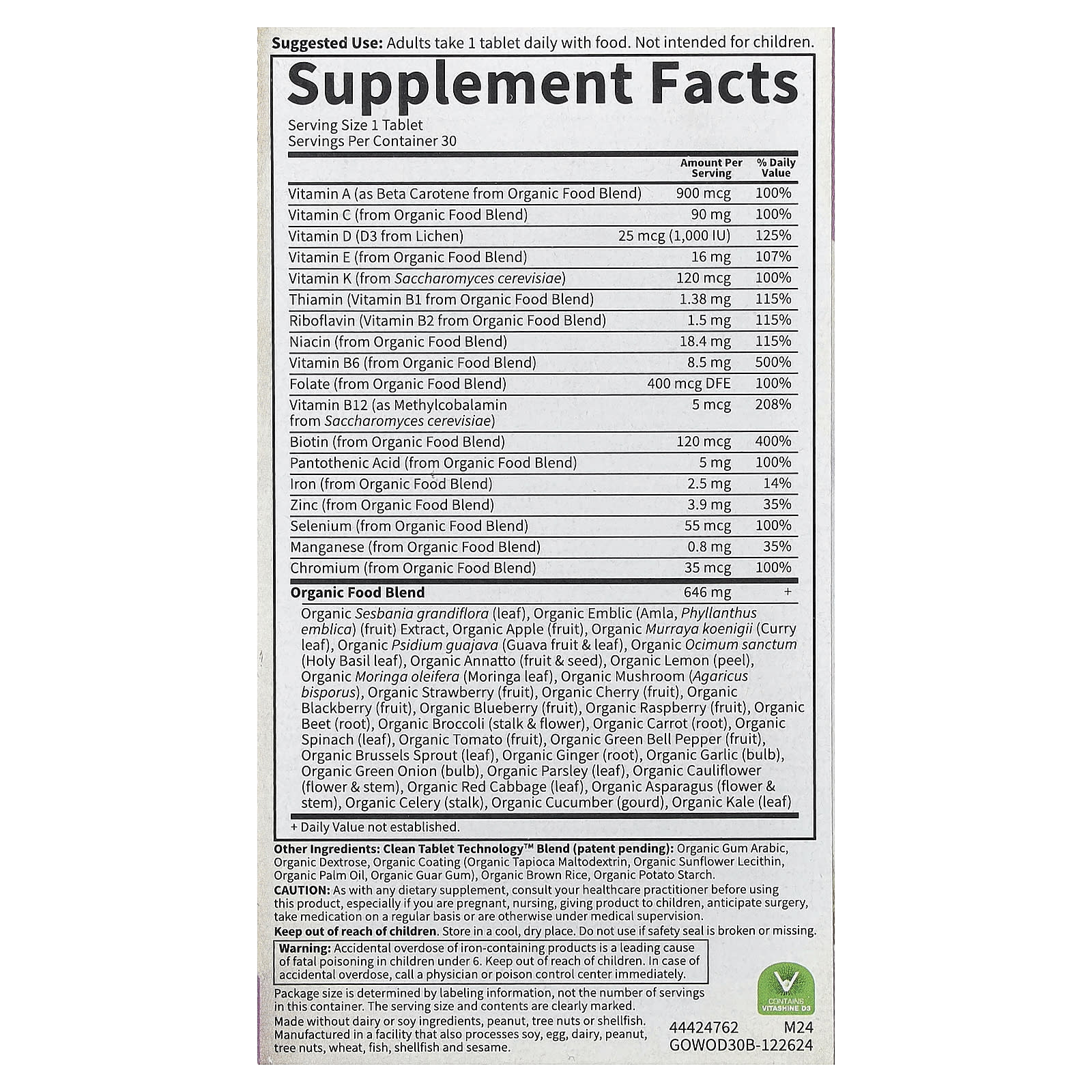 | Витамин А (в виде бета-каротина из смеси органических пищевых продуктов) | 900 мкг | 100% |