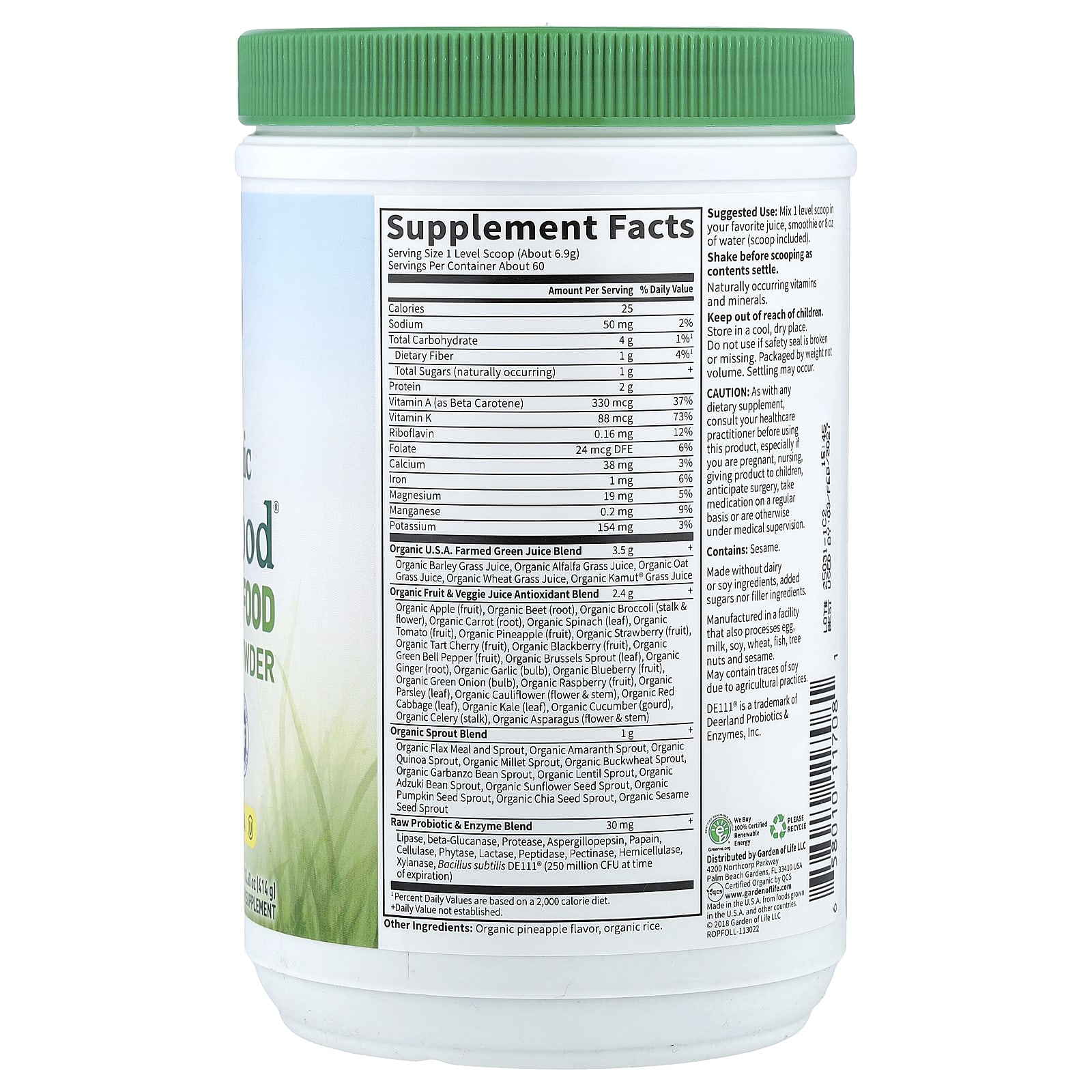 Raw Organic Perfect Food® содержит 40 ингредиентов, богатых питательными веществами, включая свежую зелень, высушенную при низкой температуре для сохранения питательных веществ, а также ростки, фрукты и овощи, а также живые пробиотики и ферменты для пищеварения.