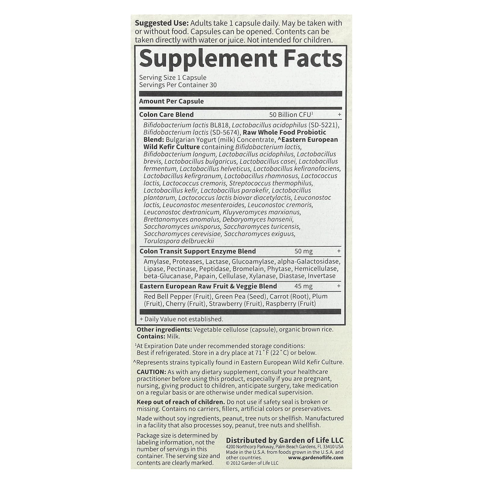 50 миллиардов КОЕ, обычно содержит 33 пробиотика клинически изученных штаммов плюс восточноевропейскую дикую кефирную культуру