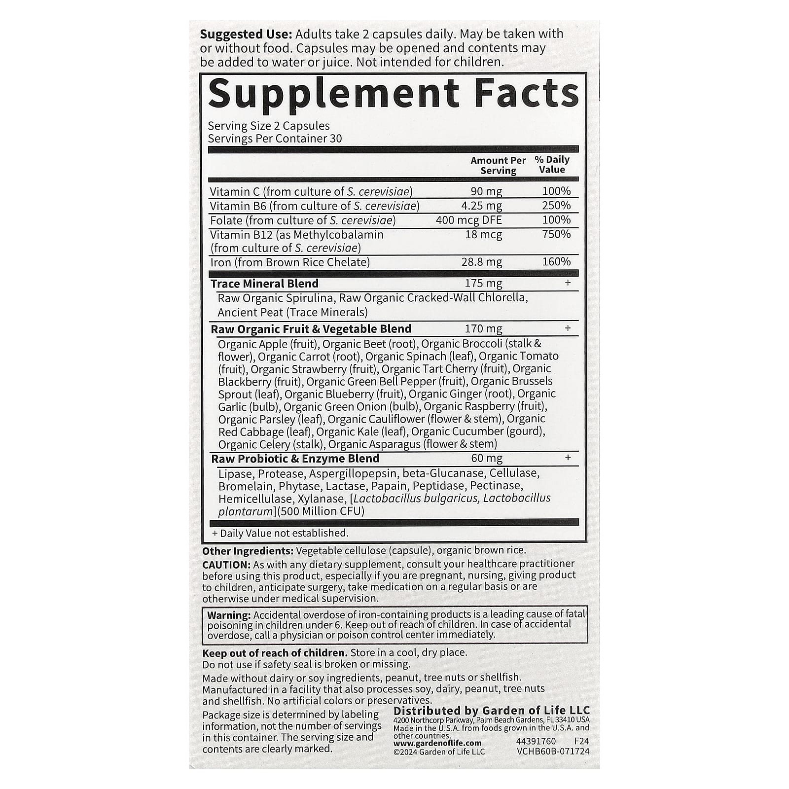 | Смесь необработанных органических фруктов и овощей органическое яблоко (плод), органическая свекла (корень), органическая брокколи (стебель и цветок), органическая морковь (корень), органический шпинат (лист), органический томат (плод), органическая клубника (плод), органическая вишня (плод) , органические плоды ежевики, плоды органического зеленого болгарского перца, органические листья брюссельской капусты, органические плоды голубики, корень органического имбиря, луковицы органического чеснока, луковицы органического зеленого лука, органические плоды малины ( плоды), органическая петрушка (лист), органическая цветная капуста (цветок и стебель), органическая красная капуста (лист), органическая капуста (лист), органический огурец (тыква), органический сельдерей (стебель), органическая спаржа (цветок и стебель) | 170 мг | + |