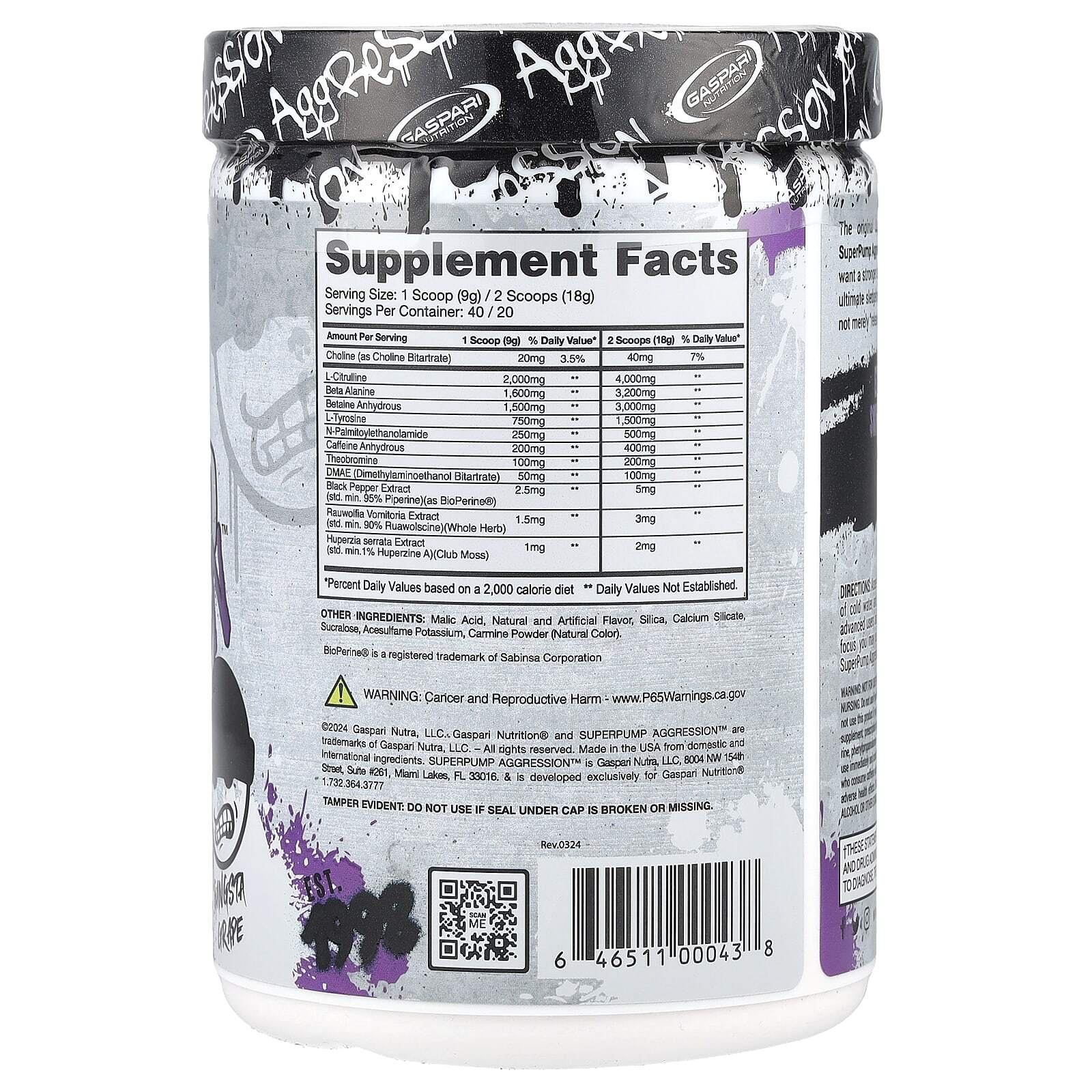 Оцените свою переносимость, выпив 1 мерную ложку (9 г), запивая 3-4 унциями холодной воды за 20–30 минут до тренировки. Для продвинутых пользователей и тех, кто хочет максимизировать энергию, накачать и сосредоточиться, вы можете использовать 2 мерные ложки (18 г), запивая 6–8 унциями холодной воды. SuperPump Aggression следует использовать только в дни тренировок.