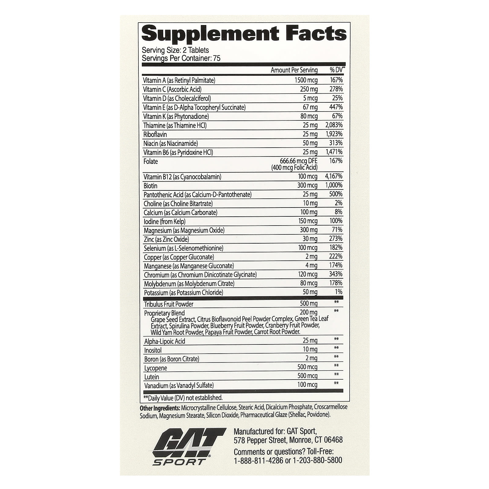 Mens Multi+Test — это комплекс витаминов, минералов и энергетических мультивитаминов с добавлением ингредиента для мужской силы — якорцов стелющихся (Tribulus terrestris). Добавка GAT Mens Multi поможет спортсменам полностью восполнить дефицит питательных веществ, в которых они могут нуждаться, а также предлагает дополнительную поддержку для мужской силы и повышение уровня тестостерона.