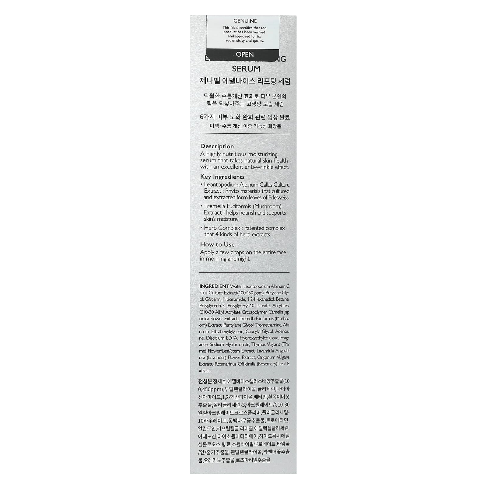 Вода, экстракт культуры leontopodium alpinum ceallus (100450 част. / млн), бутиленгликоль, глицерин, никотинамид, 1,2-гександиол, бетаин, полиглицерин-3, полиглицерил 10 лаурат, акрилат/c10-30 алкил акрилат кроссполимер, экстракт цветков камелии японской (Camellia japonica), экстракт снежного гриба (Tremella fuciformis), пентилен гликоль, трометамин, аллантоин, этилгексилглицерин, каприлилгликоль, аденозин, двунатриевая ЭДТК, гидроксиэтилцеллюлоза, отдушка, гиалуронат натрия, экстракт цветков / листьев / стеблей тимьяна (Thymus vulgaris), экстракт цветков лаванды (Lavandula angustifolia), экстракт душицы обыкновенной (Origanum vulgare), экстракт листьев розмарина (Rosmarinus officinalis).