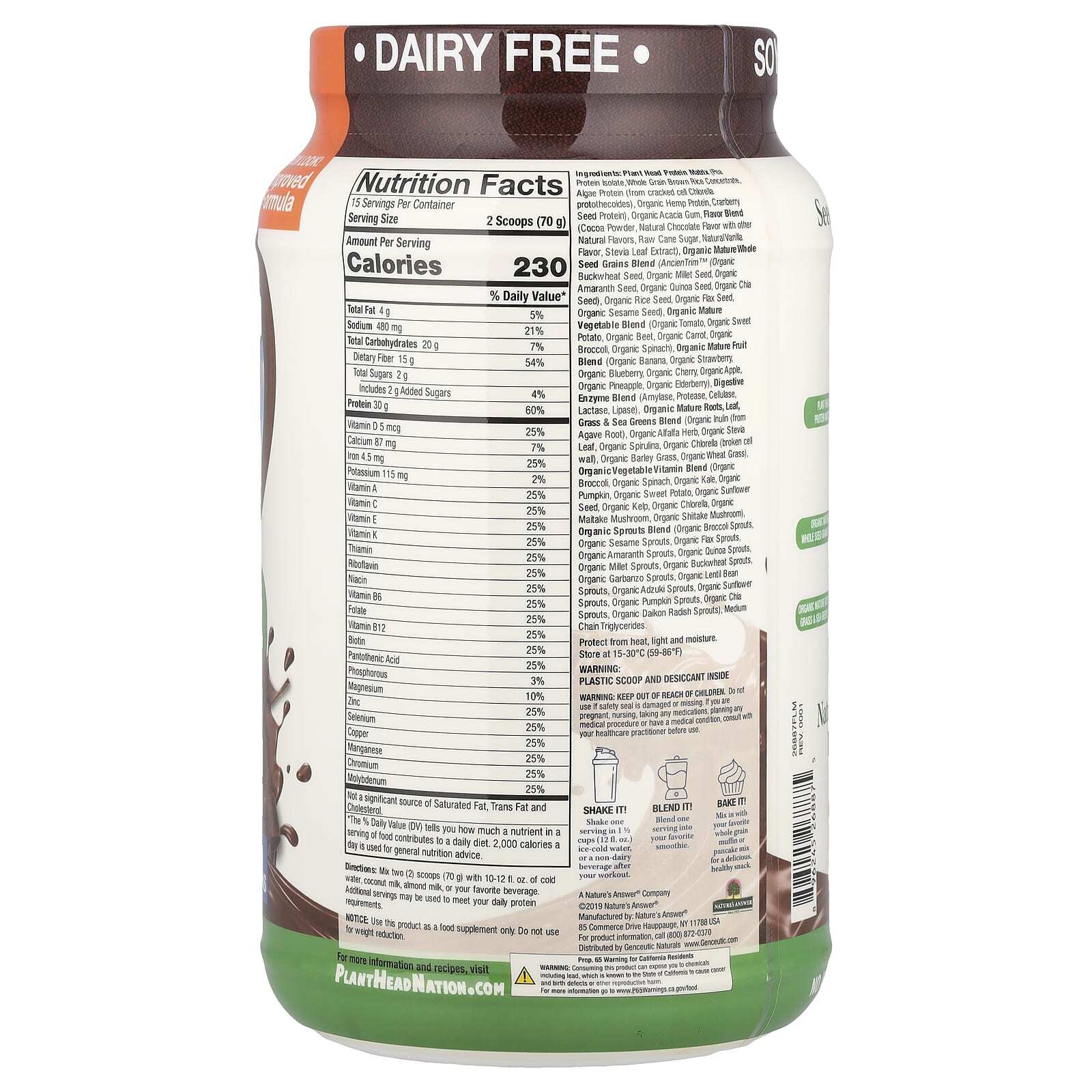 Матрица белков головки растений (изолят горохового белка, концентрат цельнозернового коричневого риса, белок водорослей (из прототекоидов хлореллы треснувших клеток), органический конопляный белок, белок семян клюквы), органическая смола акации, вкусовая смесь (какао-порошок, натуральный шоколадный ароматизатор с другими натуральными ароматизаторами, сахар-сырец, натуральный ароматизатор ванили, экстракт листьев стевии), смесь органических зрелых цельных зерен (ancientrim™) (органические семена гречихи, органические семена проса, органические семена проса, органические семена проса, органические семя амаранта, органическое семя киноа, органическое семя чиа), органическое семя риса, органическое семя льна, органический кунжут семена), органическая смесь зрелых овощей (органические помидоры, органический сладкий картофель, органическая свекла, органическая морковь, органическая брокколи, органический шпинат), смесь органических зрелых фруктов (органический банан, органическая клубника, органическая черника, органическая вишня, органическое яблоко, органический ананас, органическая бузина), смесь пищеварительных ферментов (амилаза, протеаза, целлюлаза, лактаза, липаза), органическая смесь зрелых корней, листьев, травы и морской зелени (органический инулин) (из корня агавы), органическая трава люцерны, органический лист стевии, органическая спирулина, органическая хлорелла (сломанная клеточная стенка), органическая трава ячменя, органическая пшеничная трава), смесь органических растительных витаминов (органическая брокколи, органический шпинат, органическая капуста, органический сладкий картофель, органические семена подсолнечника, органические водоросли, органическая хлорелла, органический гриб майтаке, органический гриб шиитаке), смесь органических ростков проса (органические ростки брокколи, органические ростки кунжута, органические ростки льна, органические ростки амаранта, органические ростки киноа, органические ростки проса, органические ростки гречихи, органические ростки гречихи, органические ростки гречихи, органические ростки амаранта, органические ростки киноа, органические ростки проса, органические ростки гречихи, органические ростки гречихи, органические ростки гречихи, органические ростки ростки банзо, органические ростки чечевицы, органические ростки адзуки, органический подсолнечник ростки, органические ростки тыквы, органические ростки чиа, органические ростки редиски дайкона), триглицериды со средней длиной цепи.