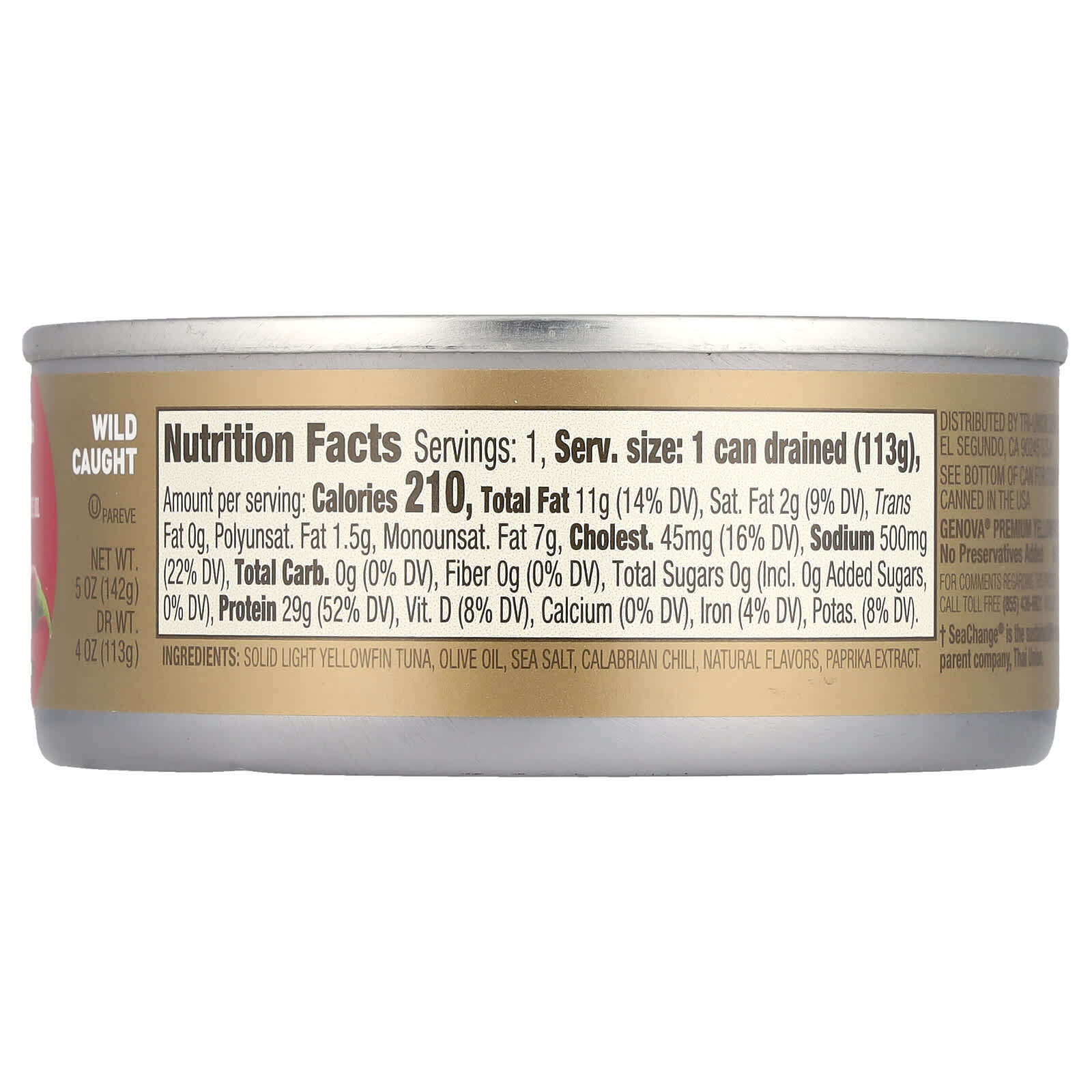Желтоперый тунец (сплошной), оливковое масло, морская соль, калабрийский перец чили, натуральные ароматизаторы, экстракт паприки.